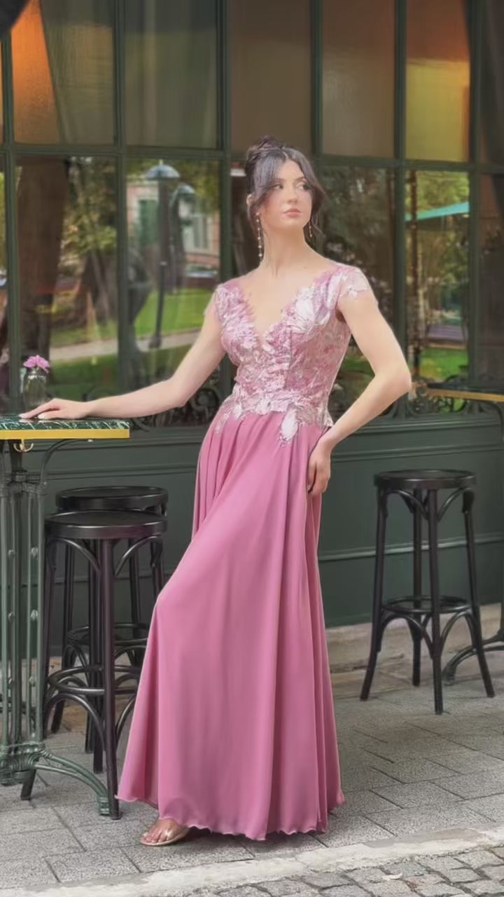 The top is V-shaped, decorated with fine cotton lace in floral motifs, which flows softly over the shoulders like a sleeve. The bottom is made of light chiffon, falling freely, with smooth movements that bring lightness and grace. The back is finished with a delicate line of buttons that add delicacy and complete the look.