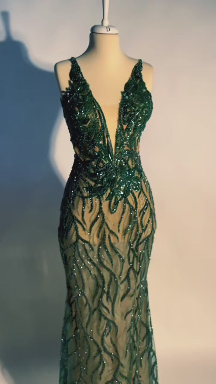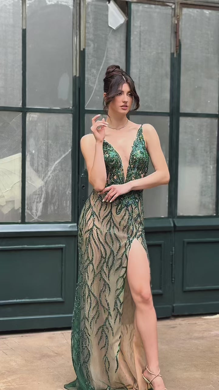 The lower part flows smoothly down the body and ends with a high slit that delicately reveals the leg. The transparent base is richly decorated with dark green shiny lace, which creates an impressive play of light and adds depth to the whole look.