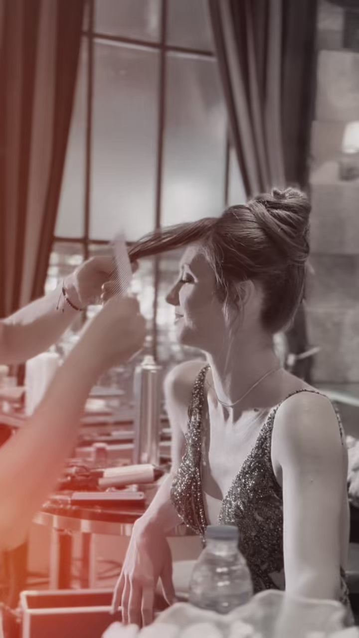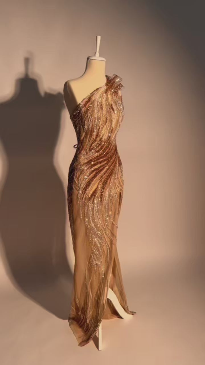 The top is corseted, with metal underwires and ties at the back. The lace, studded with sequins and beads in gold tones, follows the curves of the body in dynamic lines that create a sense of movement and sophistication. The high straight slit at the bottom adds sensuality and freedom, turning every step into an elegant dance.
