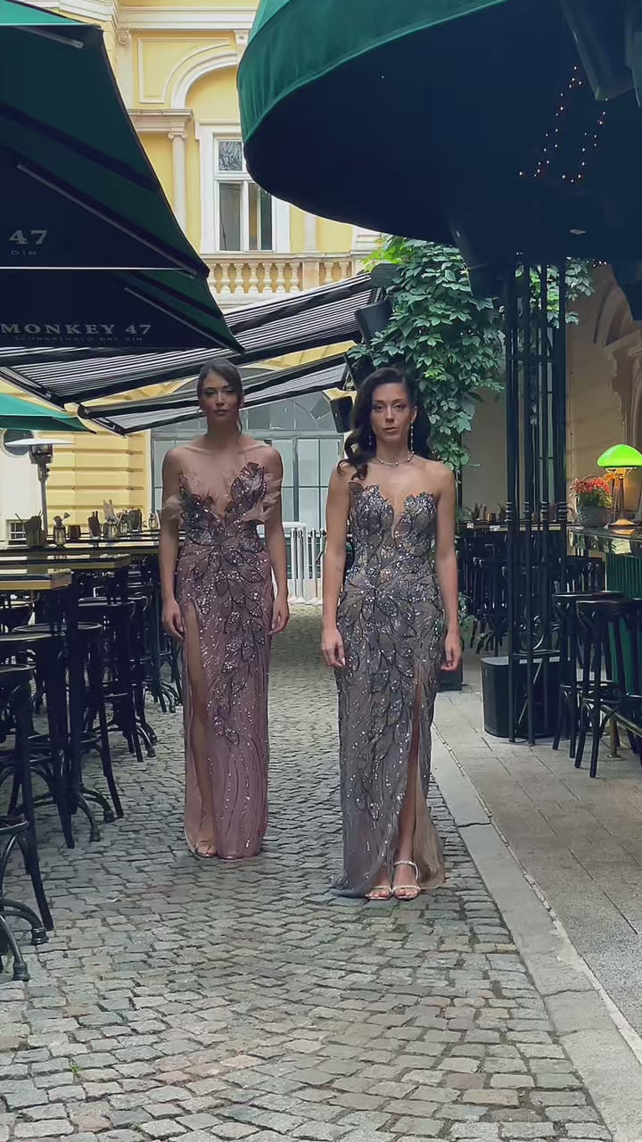 Obsira formal dress is designed to highlight the beauty and confidence of its owner. The transparent base of the V-neck is exquisitely covered with hand-sewn floral lace of multi-colored sequins and beads that catch the light with every movement.