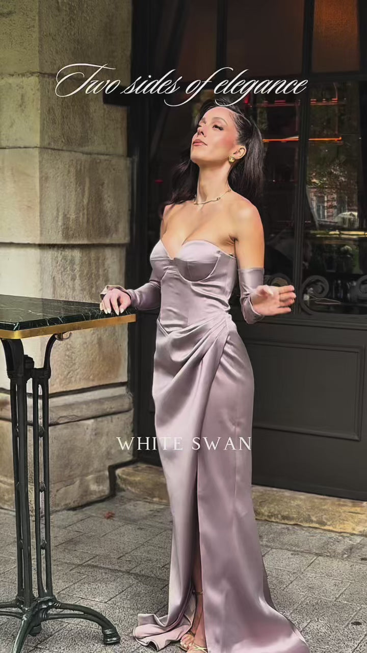 The top is corseted, with ties at the back, and the low waist adds elegance and elongates the figure. The bottom is made of elastic satin fabric - a skirt with a slit and delicate pleats that provide comfort and freedom of movement without sacrificing the sophisticated look.