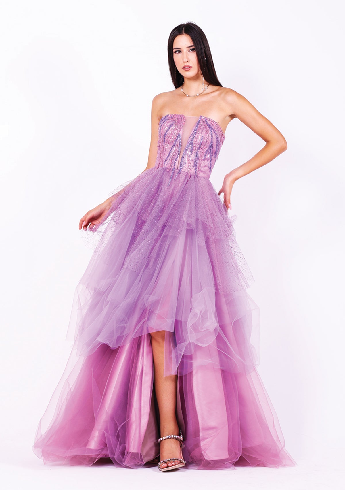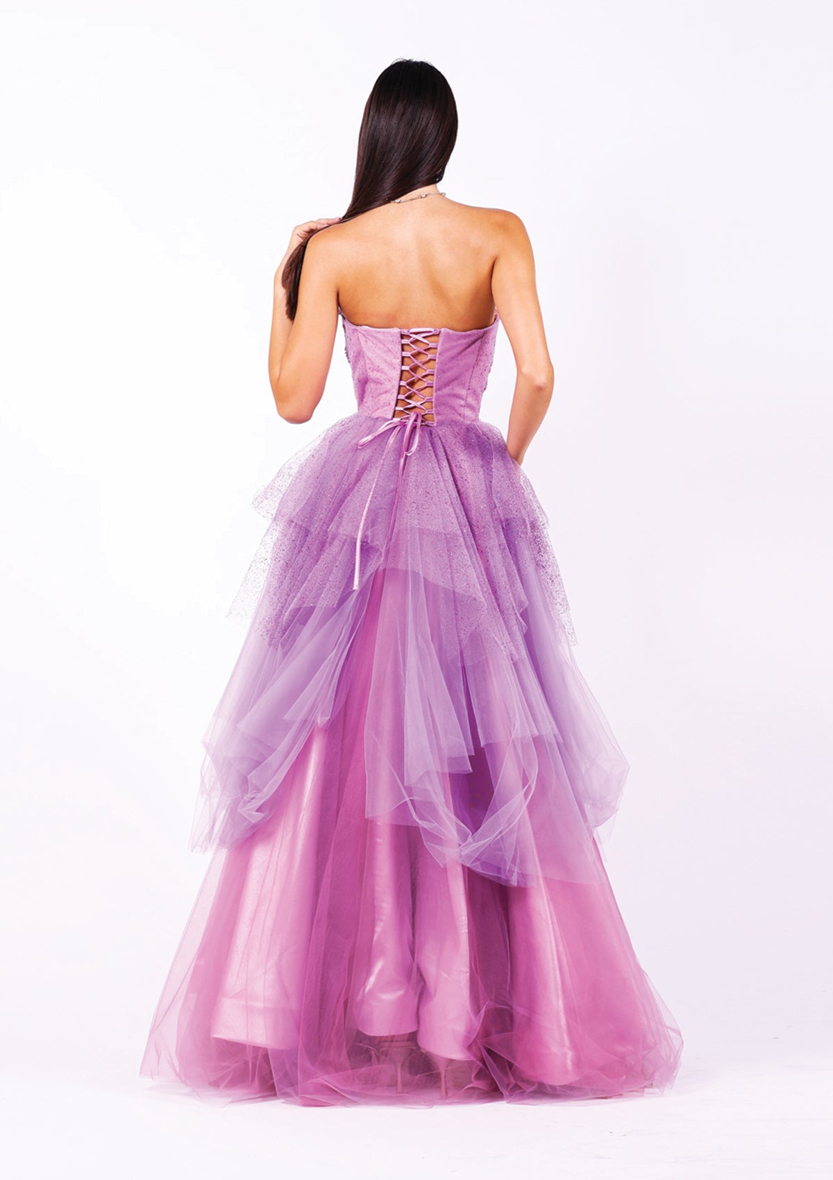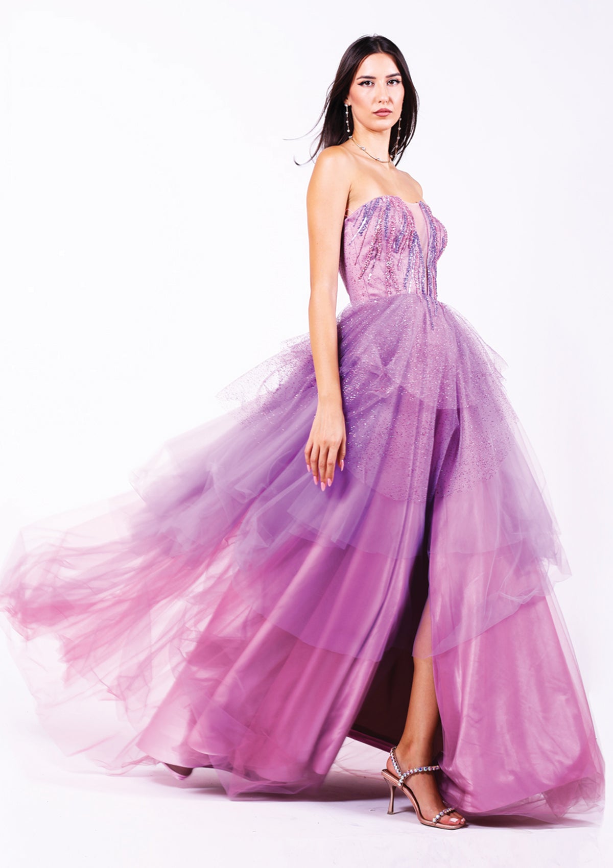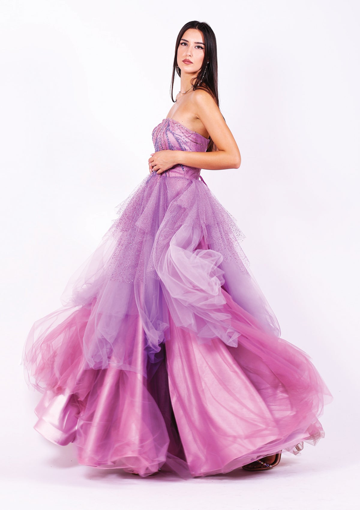 Рокля Ametrine е като танц на цветове и светлина. Асиметричните и` слоеве тюл - всеки с различен нюанс - създават усещане за движение, свобода и неподражаема индивидуалност. Горната част е с право V-образно деколте, което подчертава талията и красива ръчно обшита дантела с камъни - тип "пипала". Богатата долна част е едновременно ефирна и дръзка с елегантна дълбока цепка.