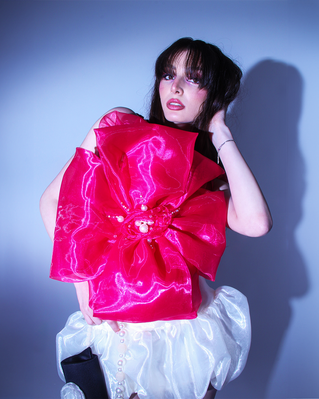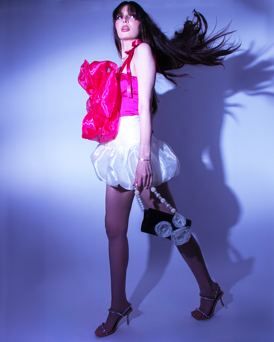 Кокетна къса рокля с драматичен обем тип балон в долната част, създадена за силно присъствие и женствено излъчване. Горната част е корсетирана с равно деколте, метални банели и връзки на гърба, осигуряващи прецизно оформяне на силуета и стабилност.