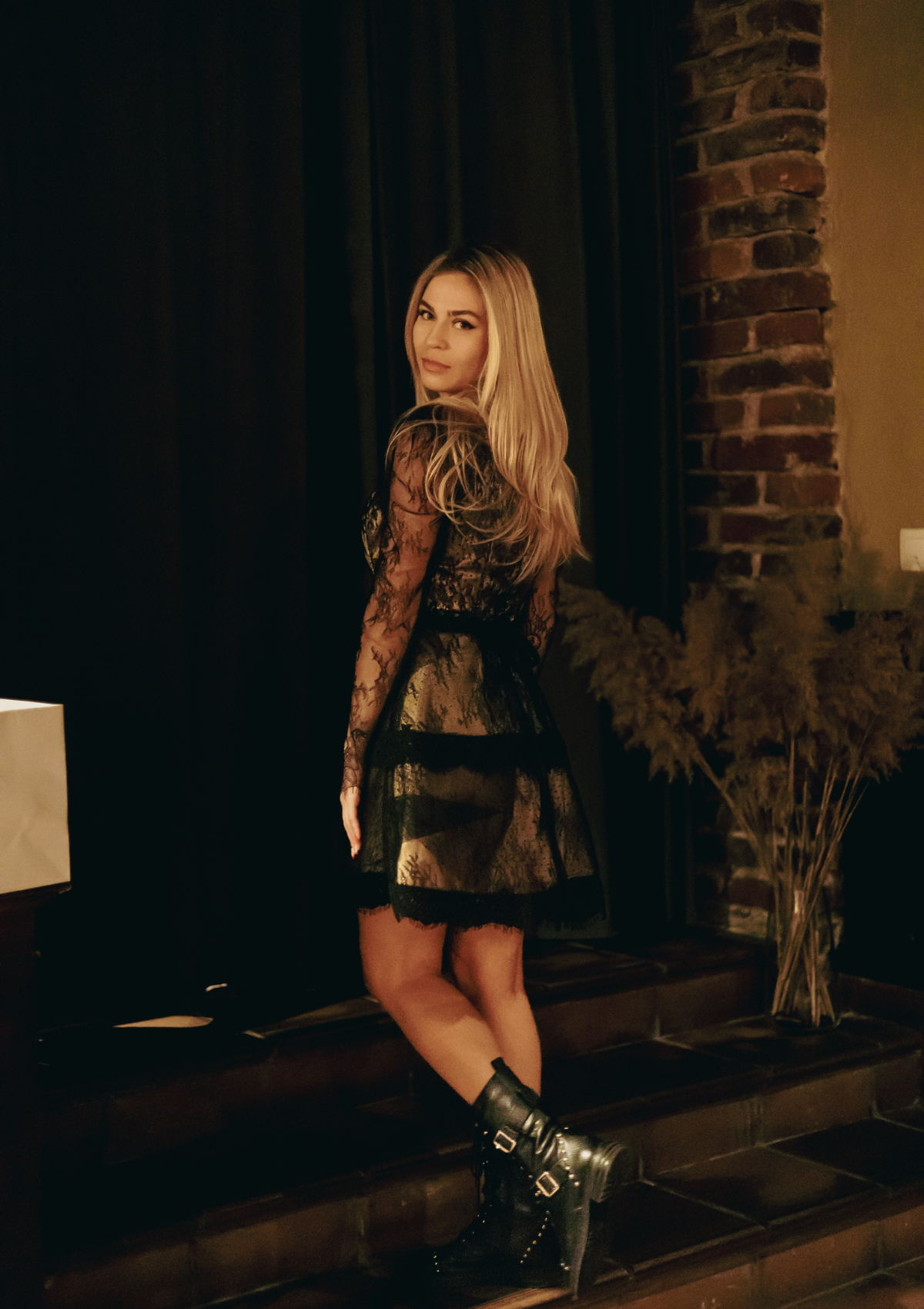 Къса черна рокля с луксозна нежна дантела и дълги ръкави, придаващи изисканост на визията.