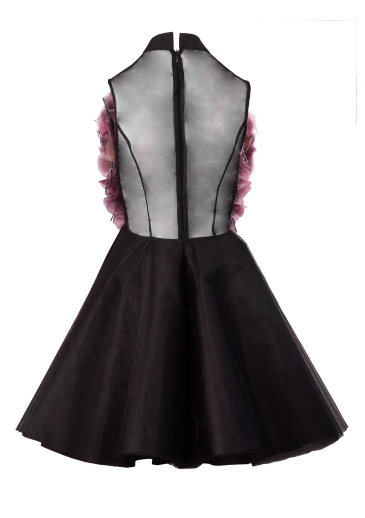 Тази къса официална рокля е изработена от луксозен сатен и впечатлява с романтична горна част от прозрачен тюл, бляскави елементи и ръчно набрани къдри, наподобяващи разцъфнали цвегя. Обемната долна част добавя ефирност и динамика на силуета, превръщайки роклята в идеален избор както за абитуриентска рокля, така и като официална рокля за специални поводи.