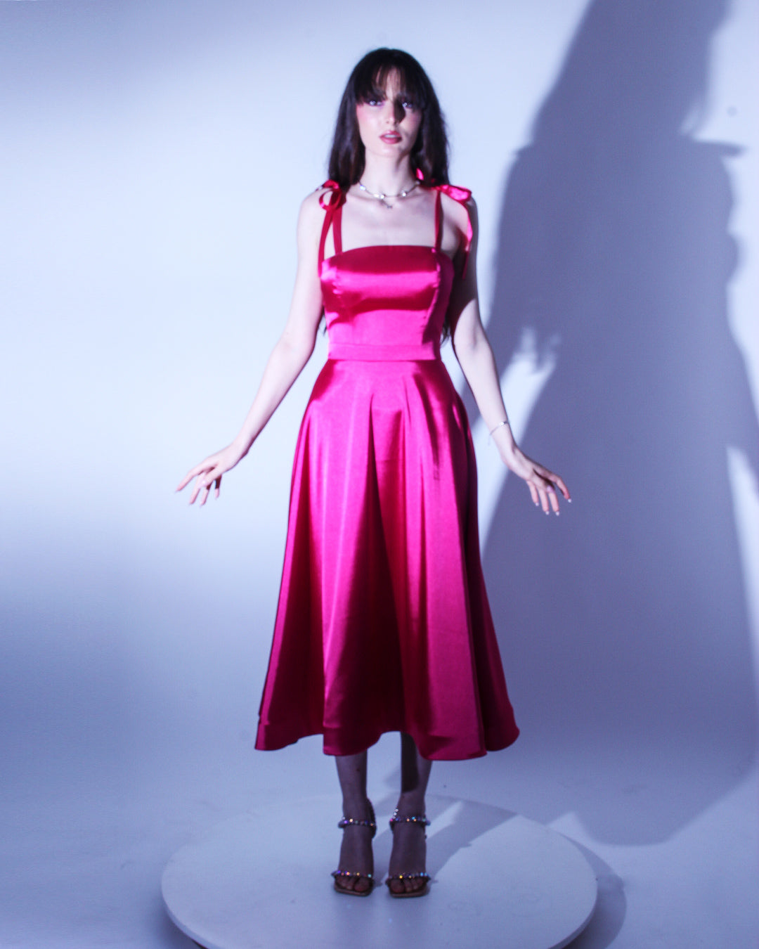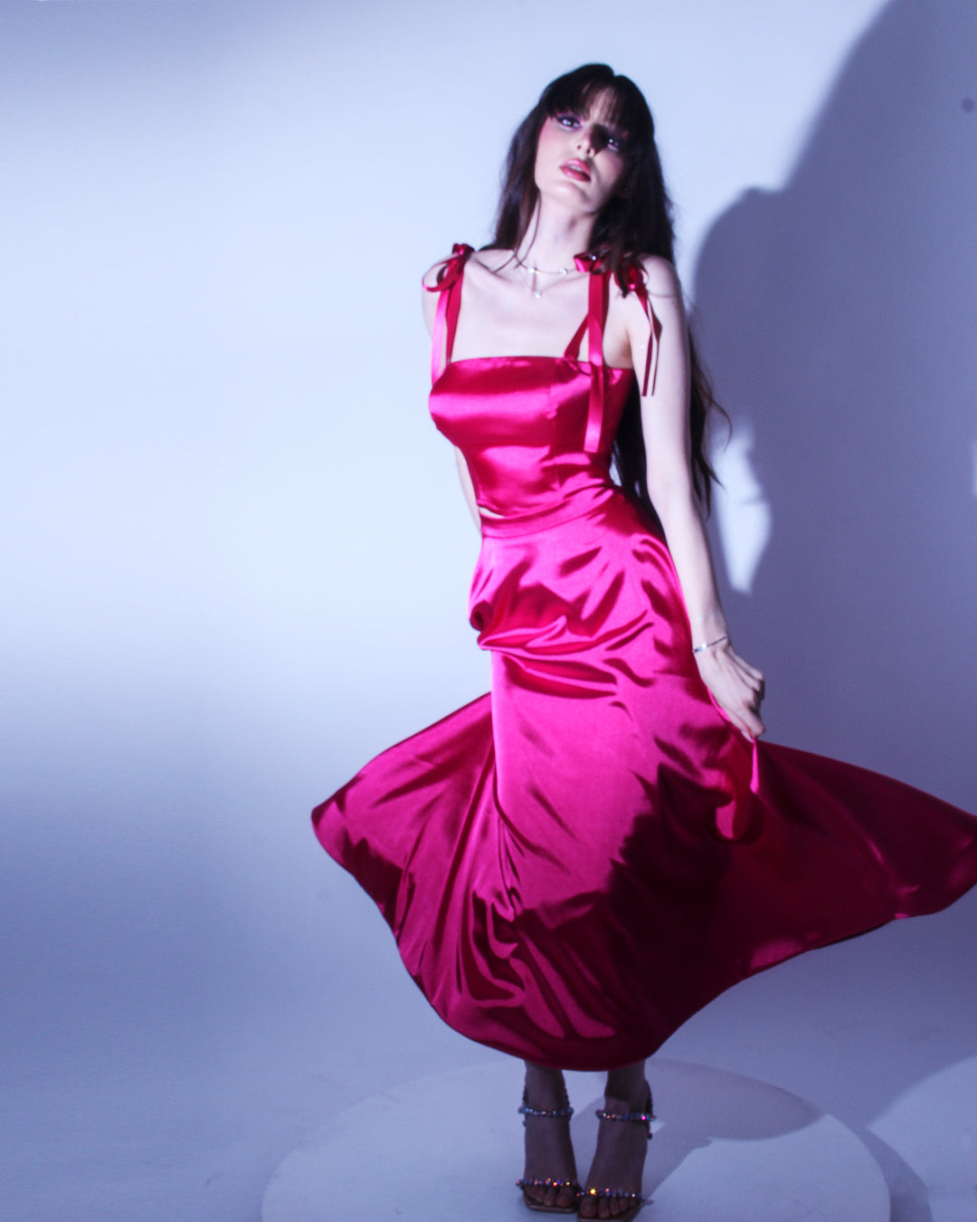 Елегантна сатенена пола пълен клош, която се носи ефирно около тялото и създава усещане за движение и изящество при всяка стъпка. Свободно падащата линия в миди дължина подчертава талията и придава романтично, но същевременно съвременно излъчване.