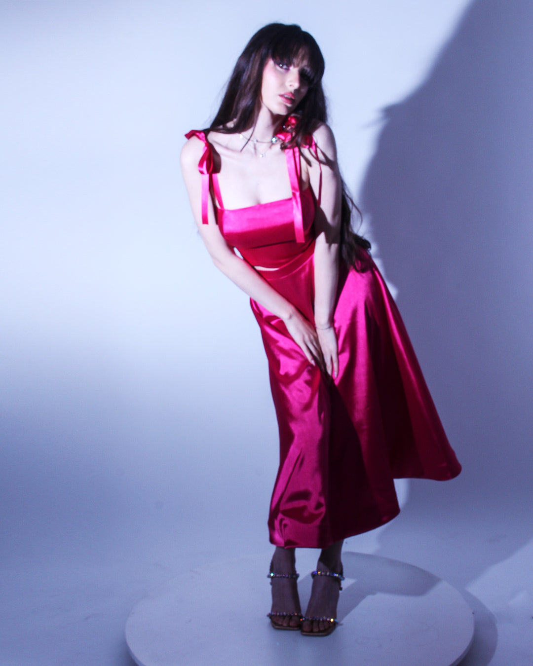Елегантна сатенена рокля със свободно падаща долна част, която създава ефирна и женствена линия при движение. Горната част е корсетирана, с метални банели, връзки на гърба и равно деколте, оформящо красиво и подчертаващо талията.