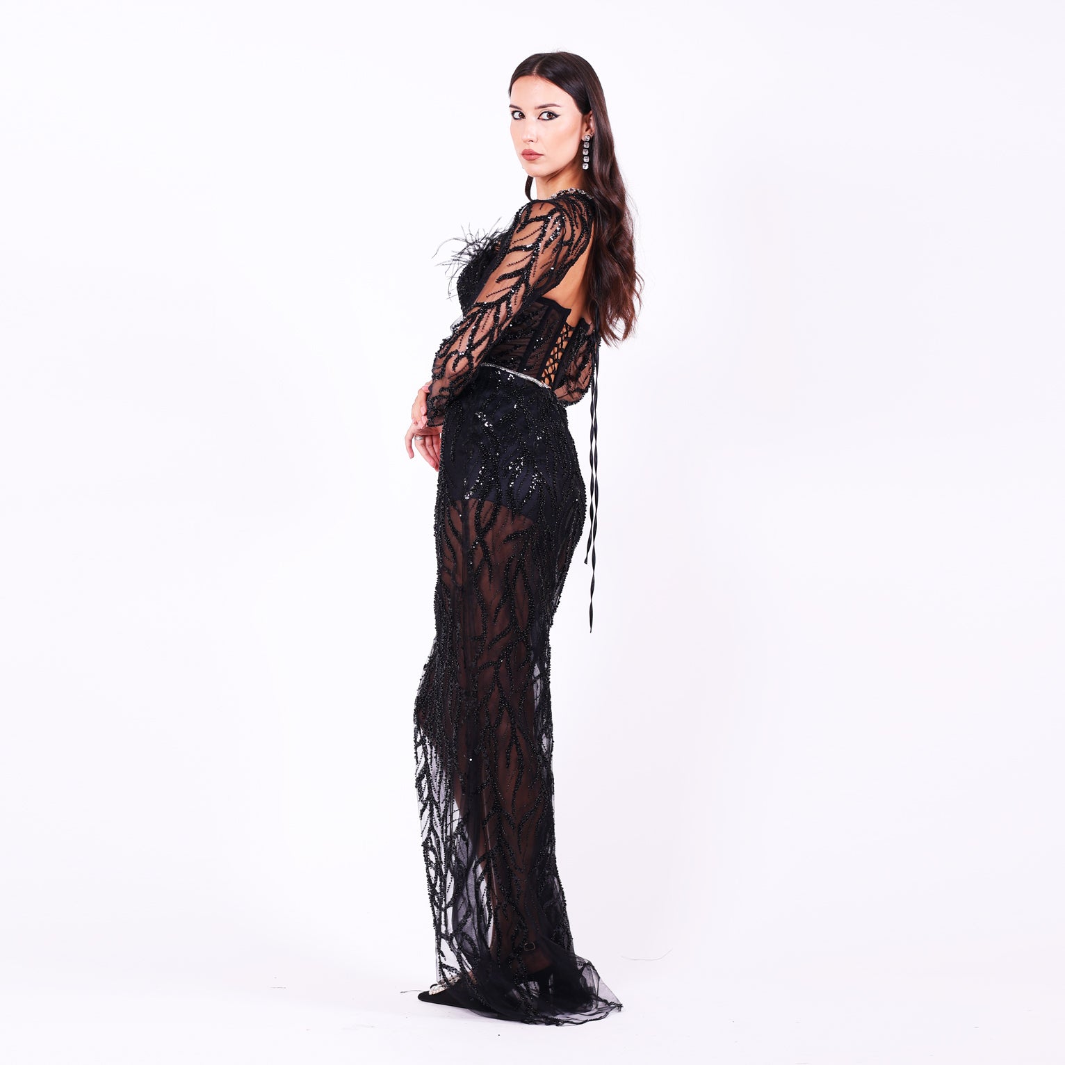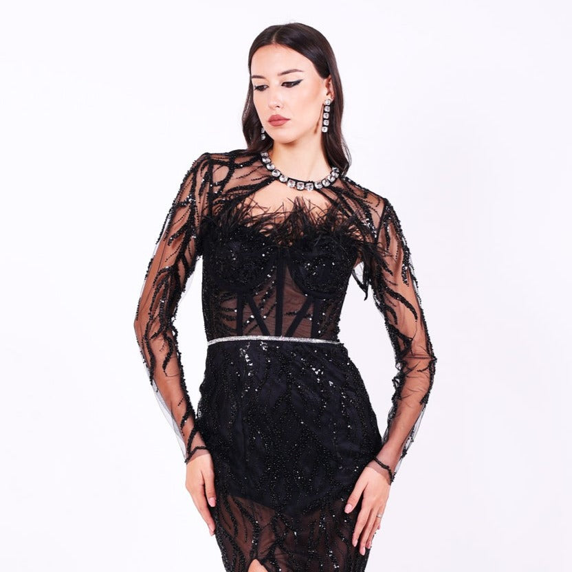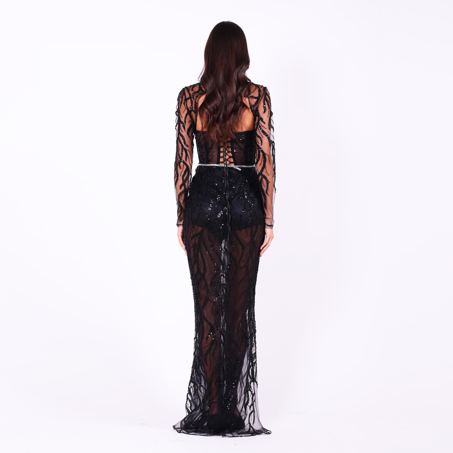 Добавете завършен щрих към своята визия с това ефектно дантелено болеро, обсипано с хиряди ръчно нашити камъни, които улавят светлината и придават блясък на всяко движение. Фината сатенена връзка на гърба не само осигурява удобство, но и подчертава елегантността на силуета.