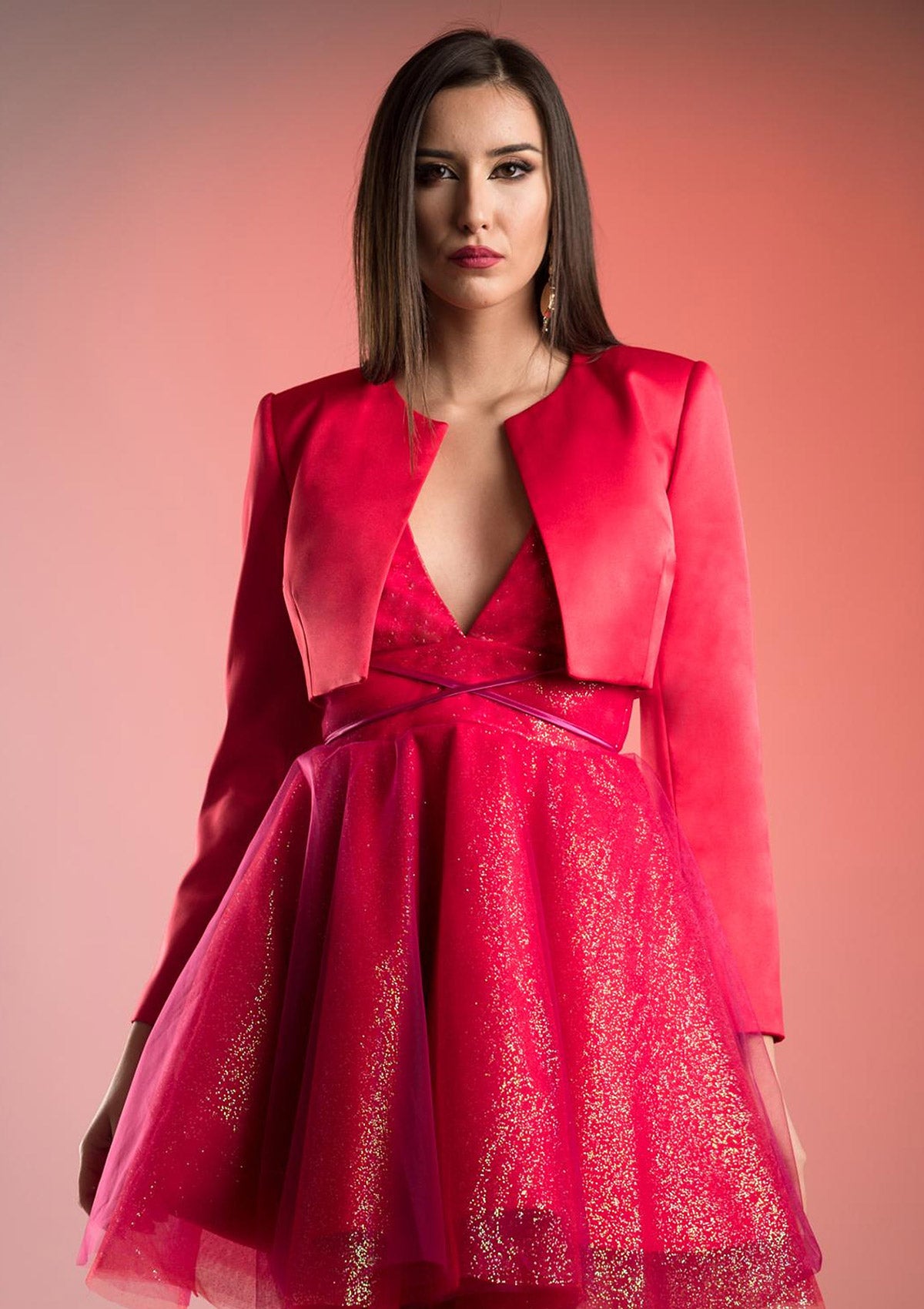 Елегантно късо сако без ревер, нежно подчертаващо талията.