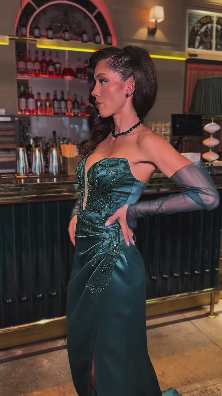 Съблазнителна и дръзка, официална рокля Scarli е създадена за жената, която обича да привлича погледи със стил и финес. Дълбокият изумруден нюанс излъчва изключителна изтънченост, а сатененият блясък подчертава красотата на силуета.