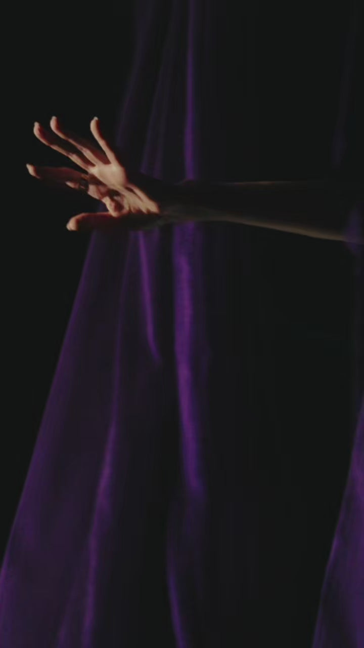 Горната част е корсетирана, с дълбоко деколте тип “диамант”. Върху нея сякаш разцъфва приказна ръчно нашита дантела, придаваща блясък и изисканост. Ефектът е подсилен от дълги прозрачни тюлени ръкавици в тон, който превръща визията в още по-впечатляваща.