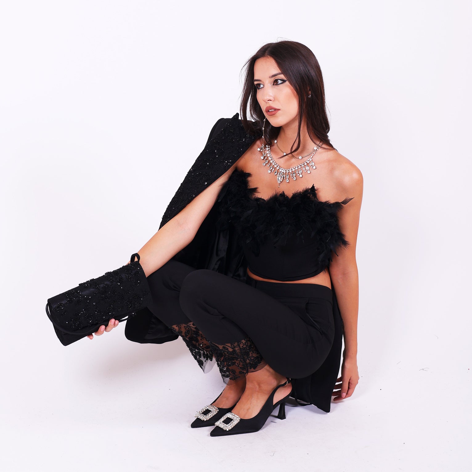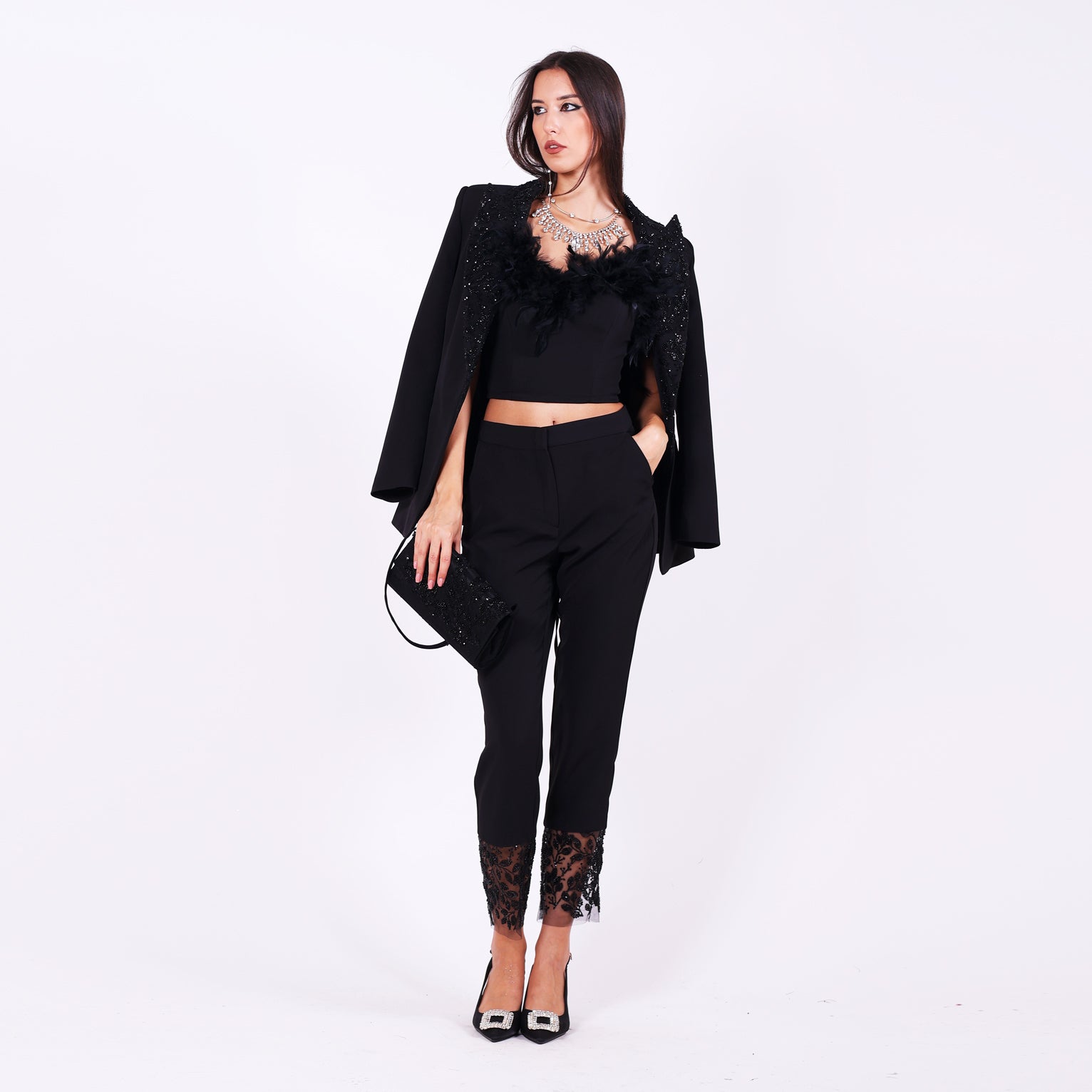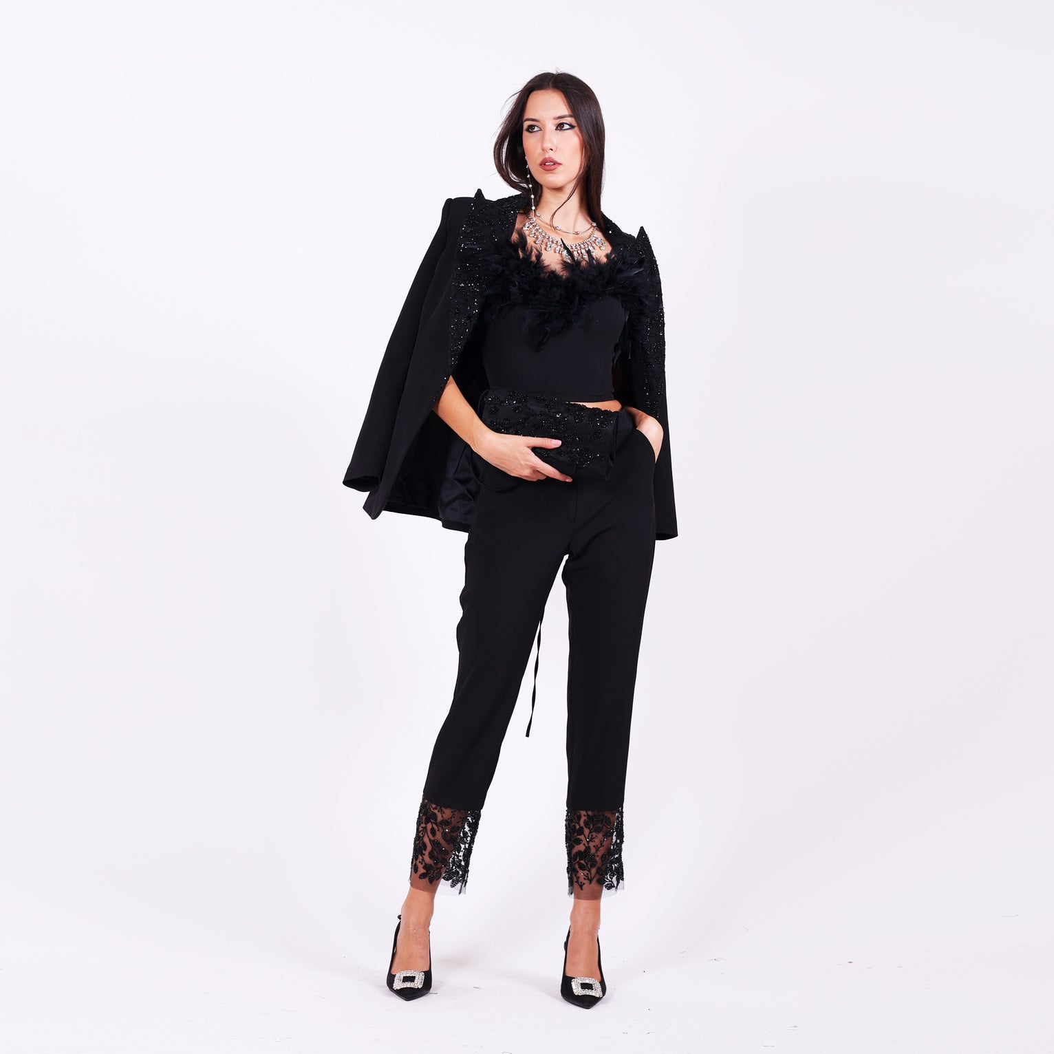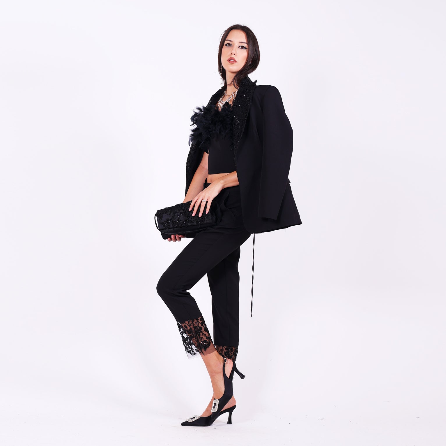 Панталон тип “цигара” с елегантна визия и подчертана женственост. Декориран с ръчно нашита дантела от фини камъчета, които придават деликатен блясък. Бордюрът от прозираща дантела в долната част добавя ефектен завършек и леко закачливо излъчване.
