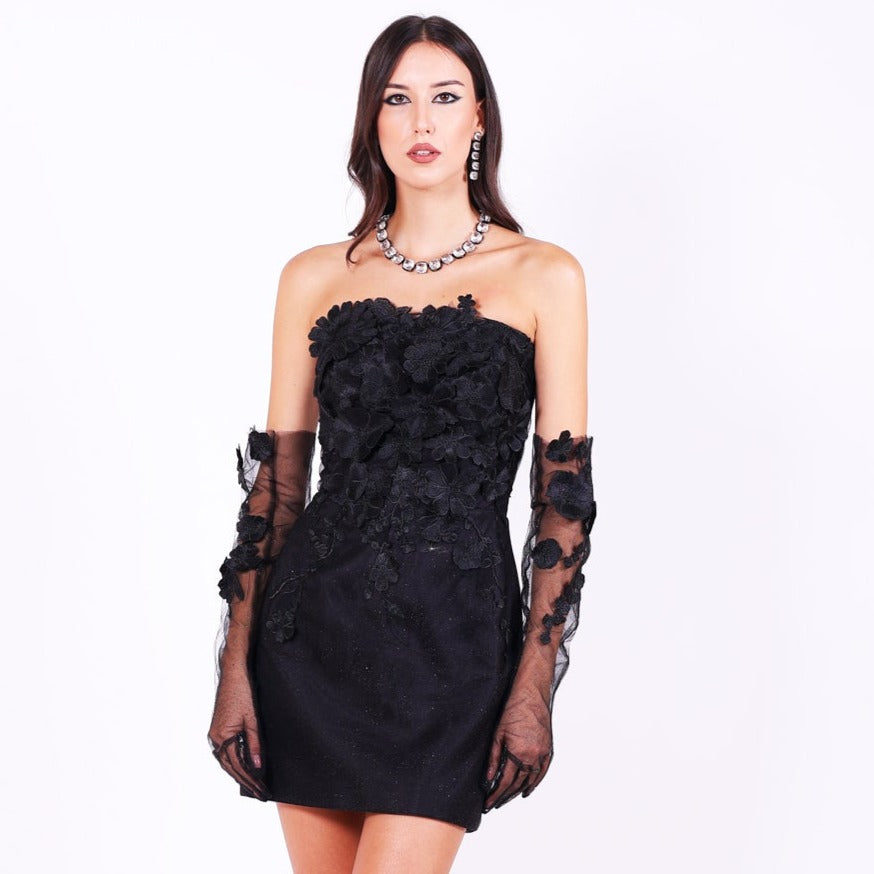 Изящна и романтична, тази къса официална рокля е създадена да омагьосва. Със своя равен корсет с чашки, метални банели и връзки на гърба, тя оформя тялото с изящество и комфорт. Основата от мек сатен е елегантно покрита с брокатен тюл, върху който са ръчно апликирани ефектни 3Д цветя. Фината дантела се разлива по цялата дължина на роклята, придавайки и` деликатност и нежност.