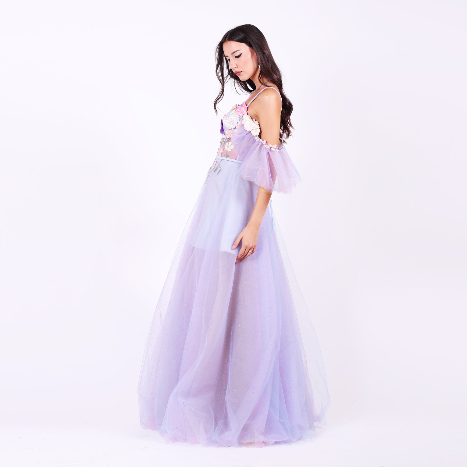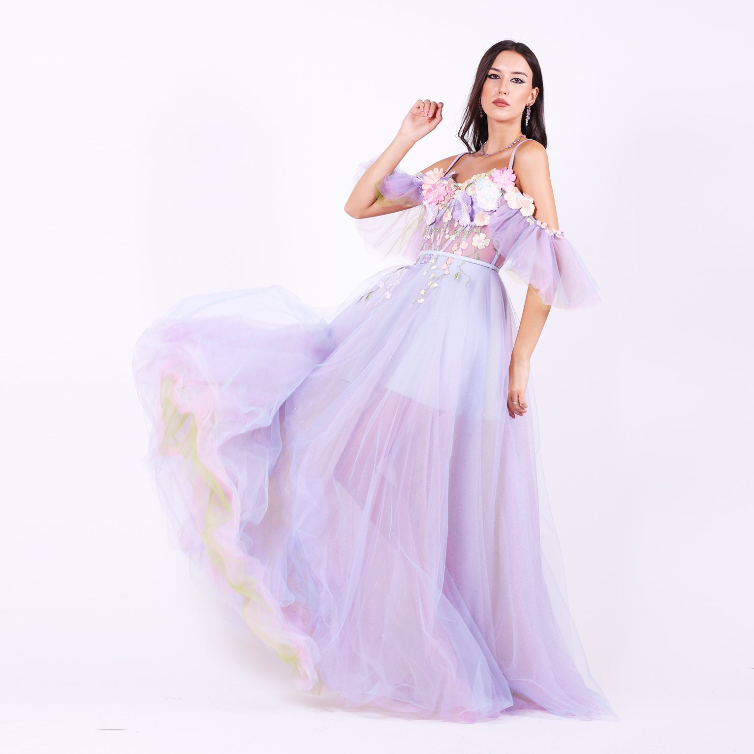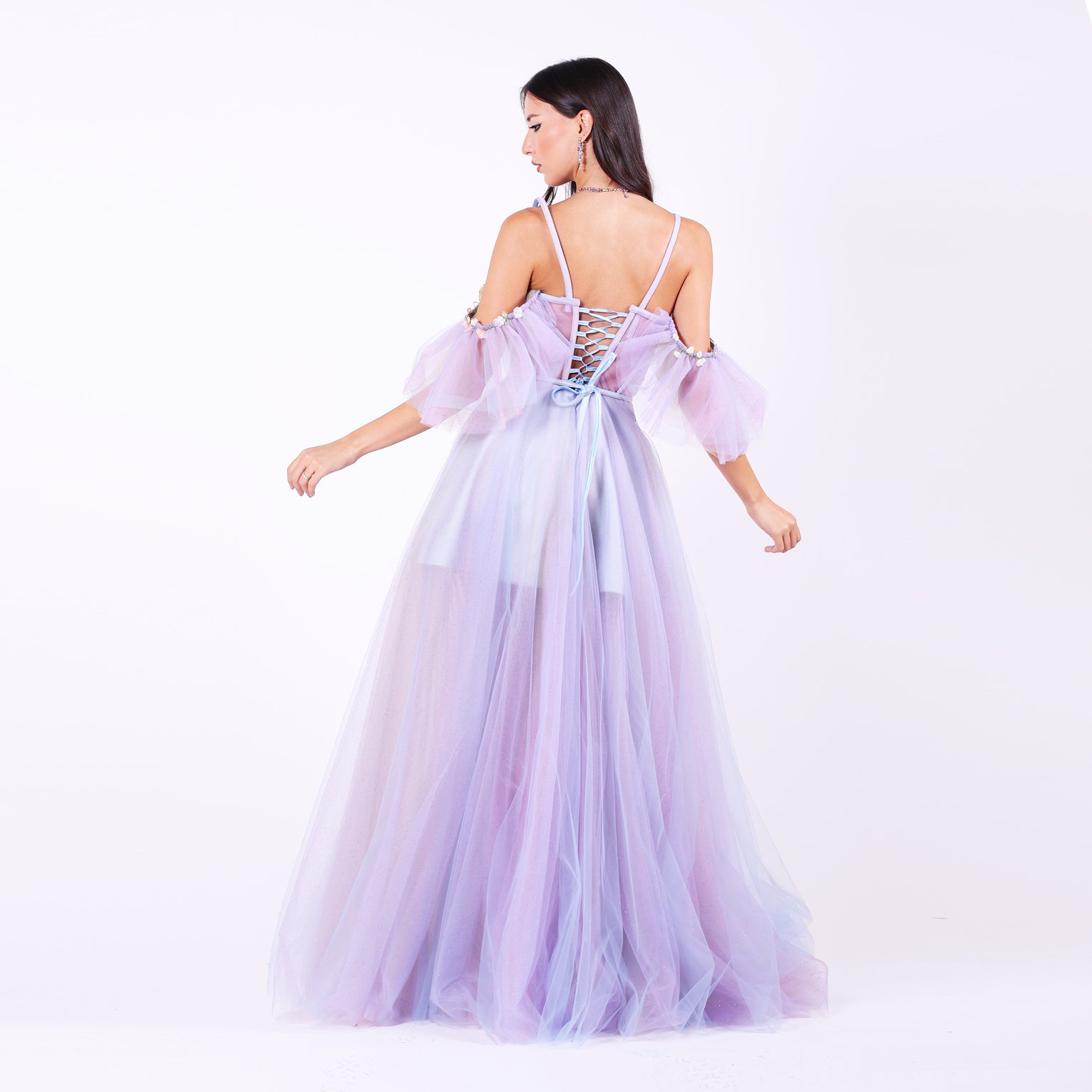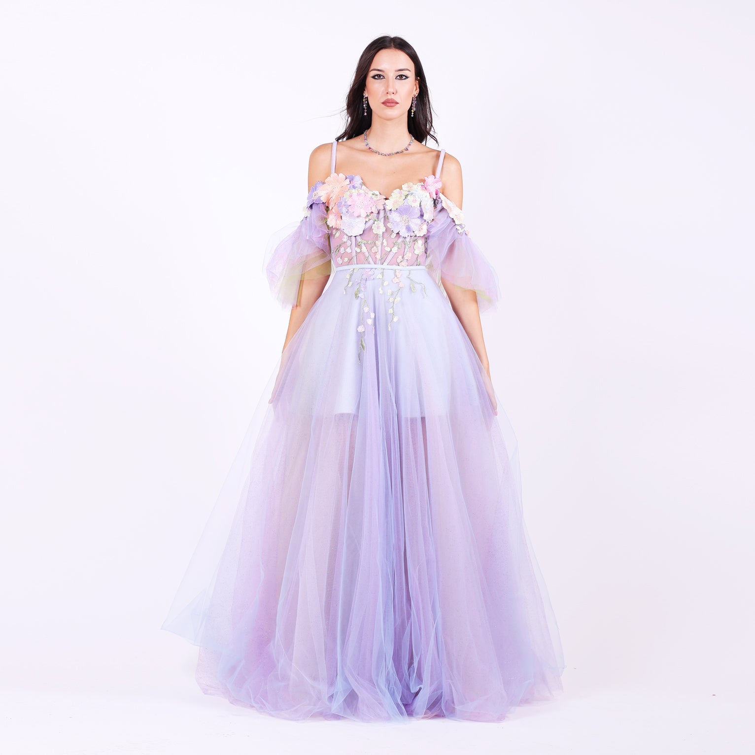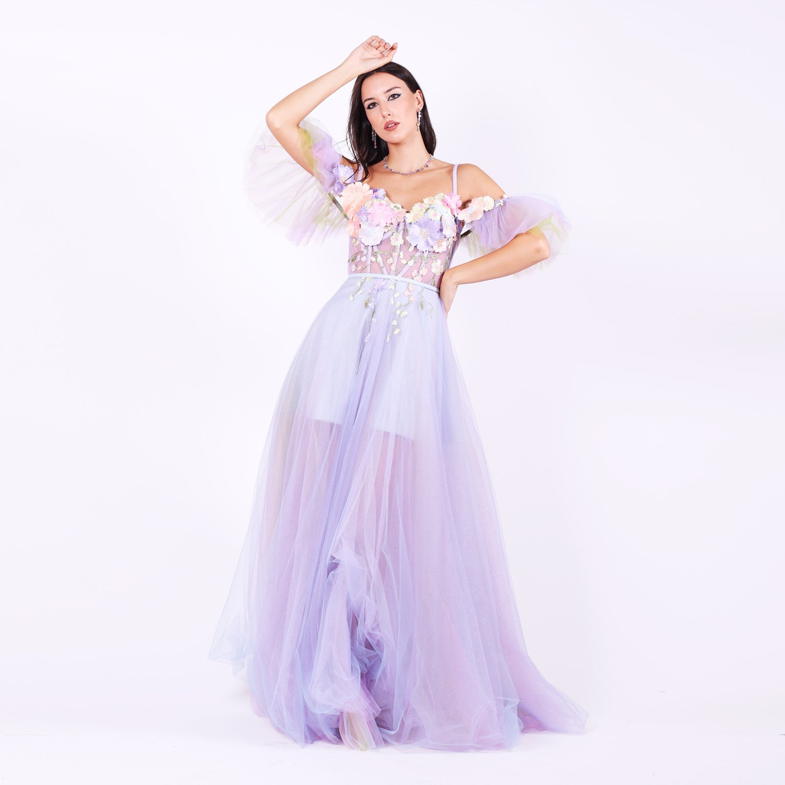 Ефирна дълга рокля от тюл с паднали ръкави, които могат да се свалят.Горната част е корсет, емблематичен за бранда ни, с метални банели, чашки и връзки на гърба, оформящ силуета с изящество. От него се спускат ръчно нашити пъстри 3Д цветя в пъстри тонове, които придават приказен характер. Бухналата пола е с преливащи нюанси тюл, създаващи дълбочина и движение.