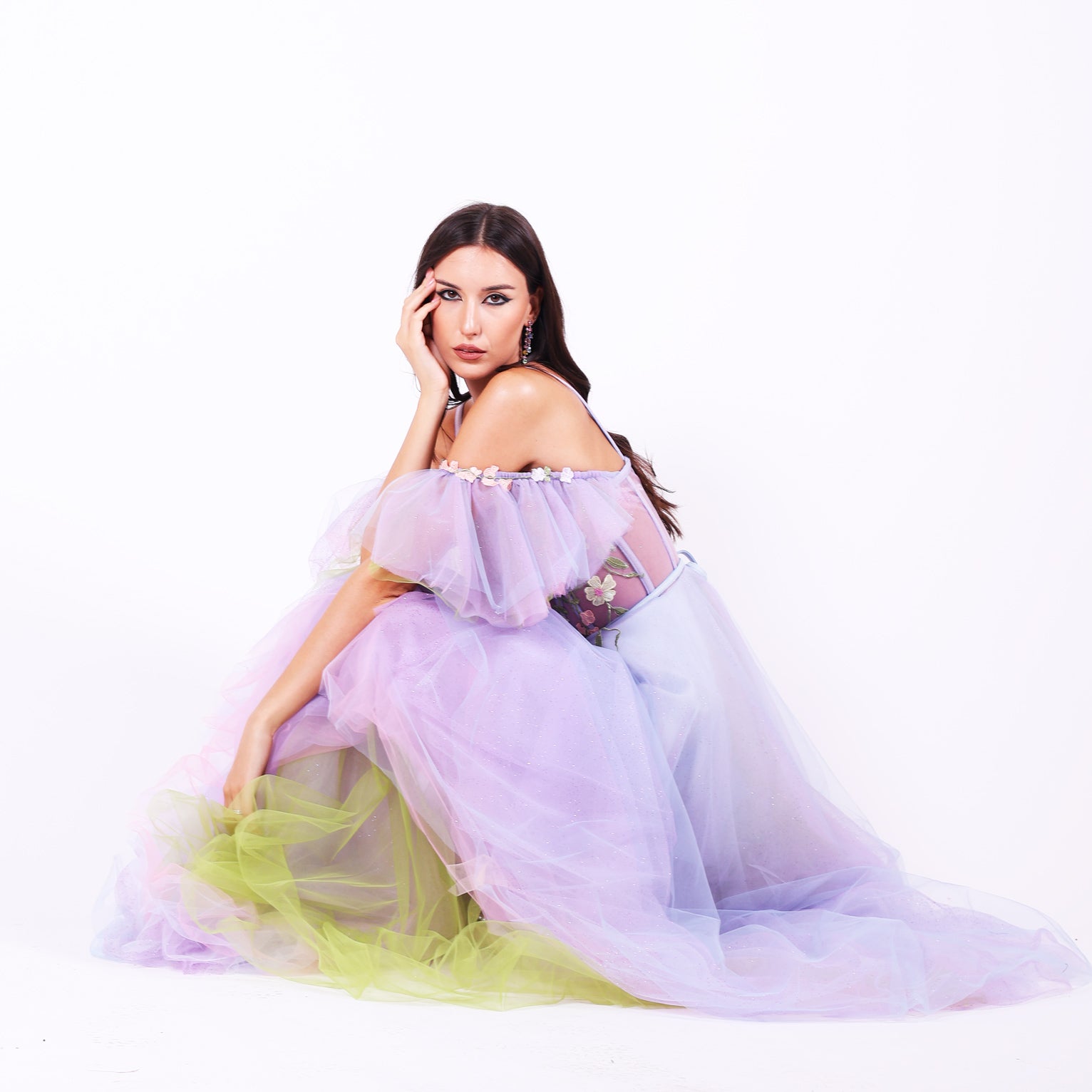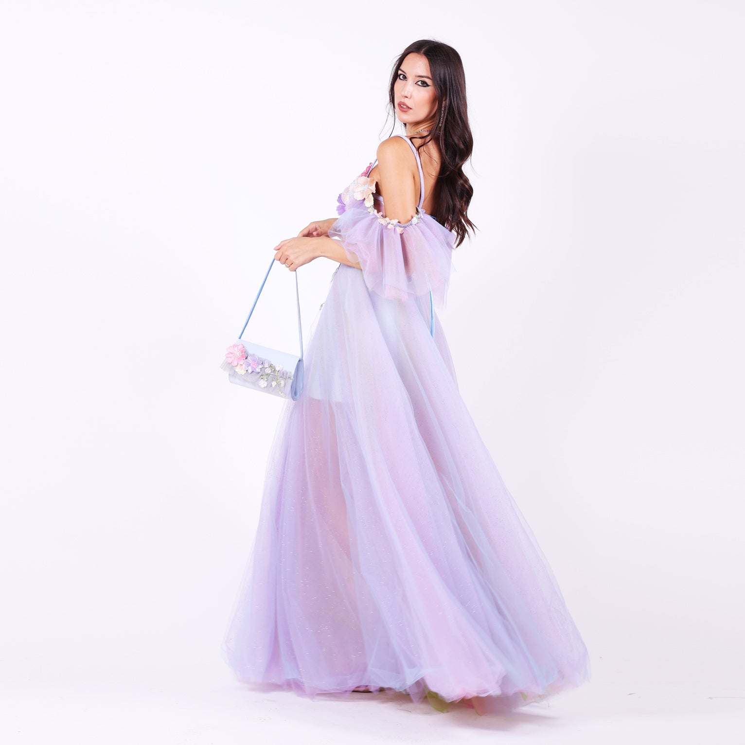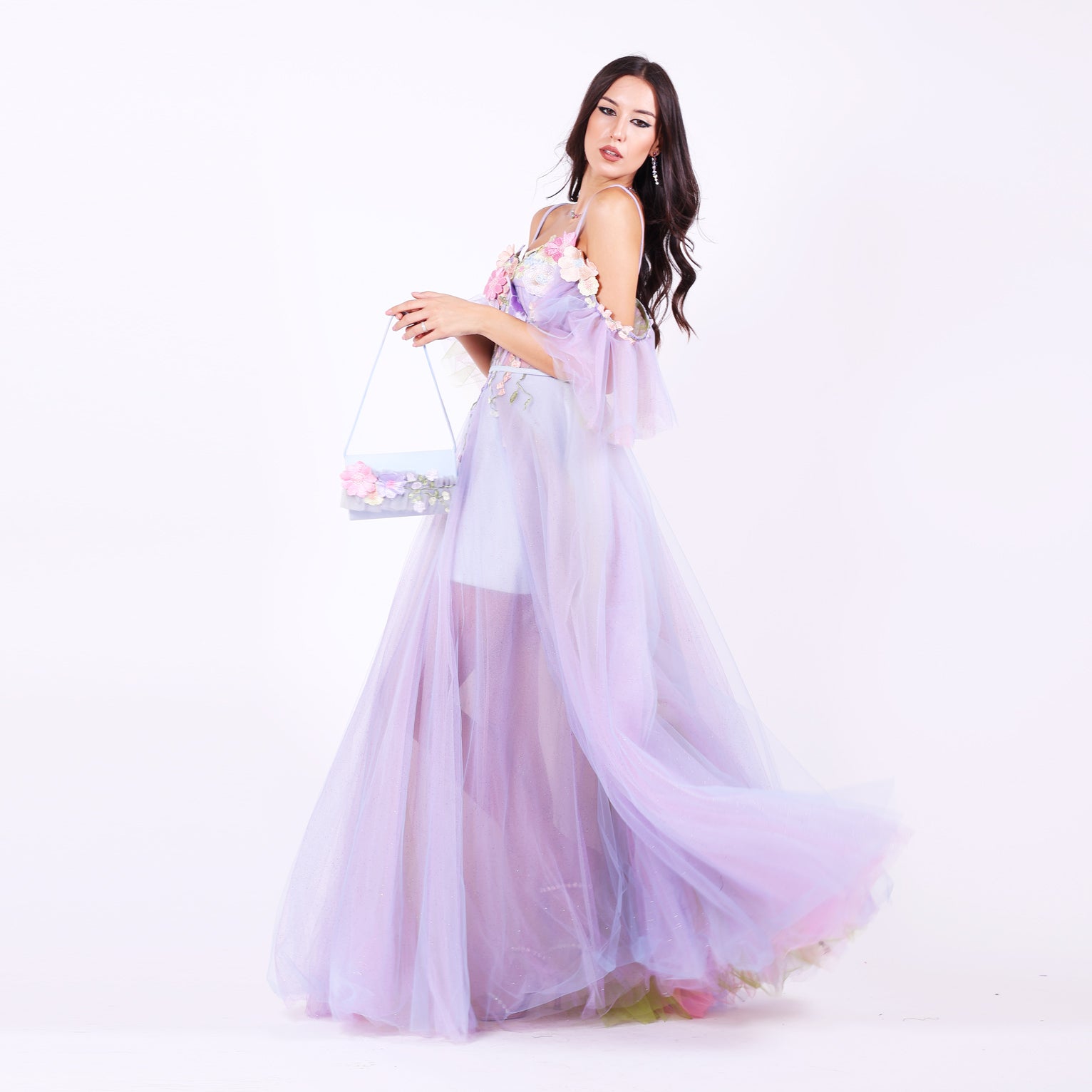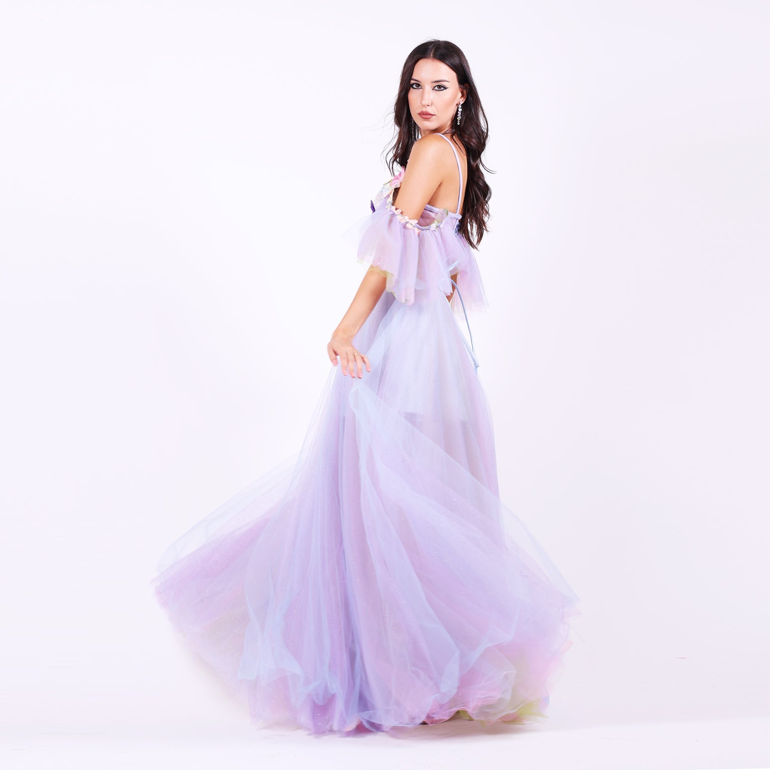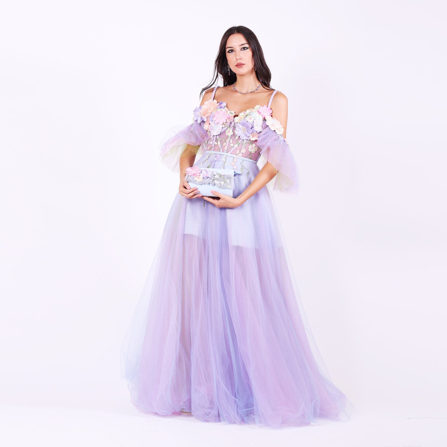 Ефирна дълга рокля от тюл с паднали ръкави, които могат да се свалят.Горната част е корсет, емблематичен за бранда ни, с метални банели, чашки и връзки на гърба, оформящ силуета с изящество. От него се спускат ръчно нашити пъстри 3Д цветя в пъстри тонове, които придават приказен характер. Бухналата пола е с преливащи нюанси тюл, създаващи дълбочина и движение.