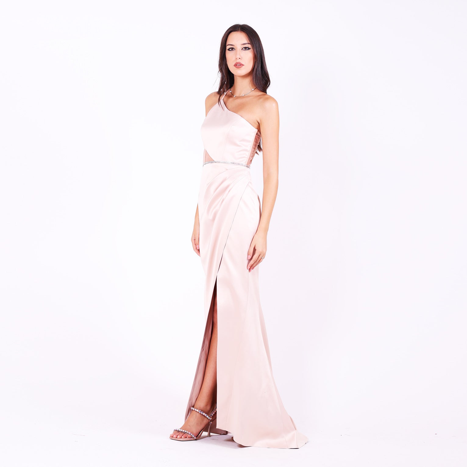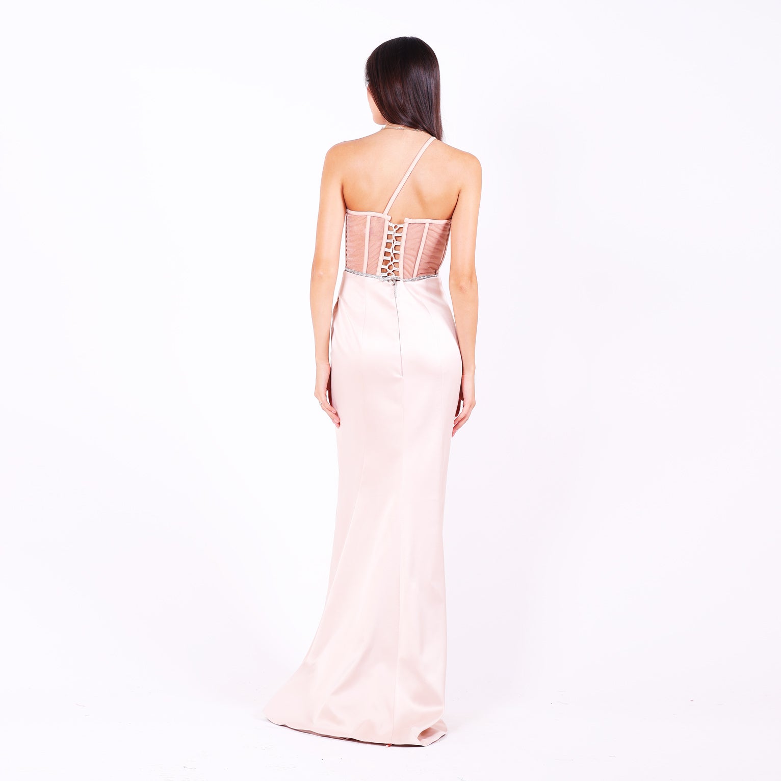 Официална рокля с асиметрично деколте и закачливи прозрачни панели, които подчертават силуета по изтънчен начин. Корсетът е с метални банели и връзки на гърба за прецизно оформяне на талията. Долната част е с чупки и елегантна цепка, осигуряващи свобода на движение и визуален баланс.