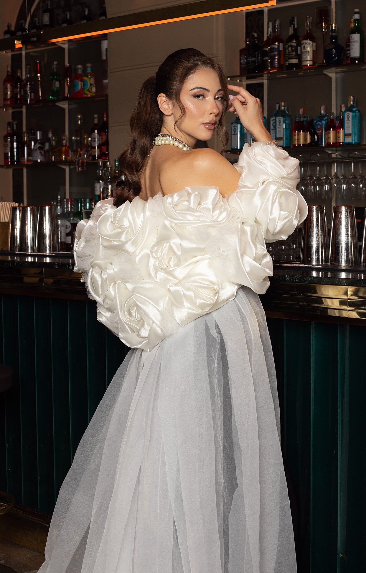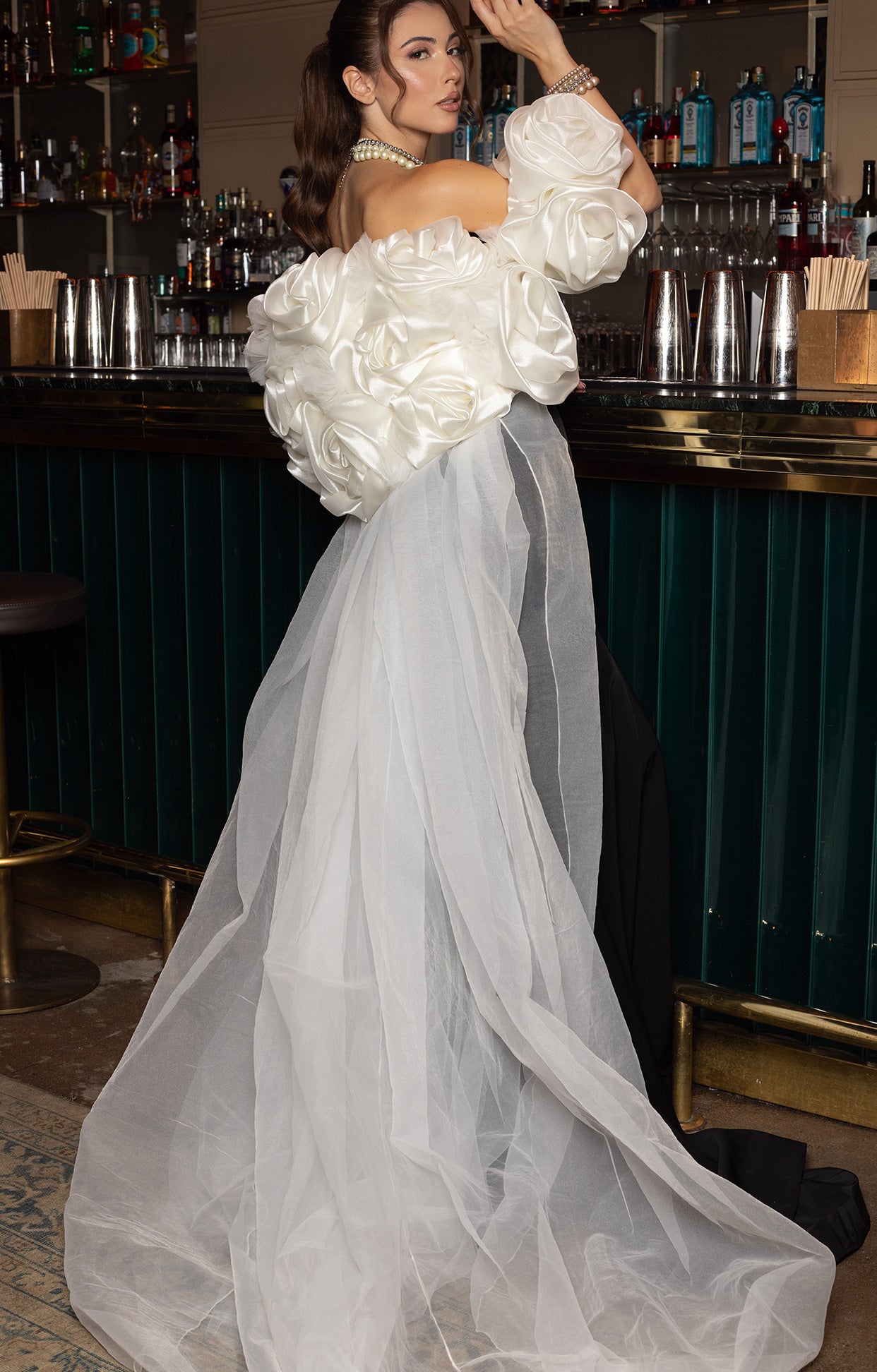 Изящно допълнение към роклята, това болеро, изработено от ефирен тюл, превръща визията в още по-запомняща се. Горната част е декорирана с ръчно изработени цветя от органза, които разцъфват като нежни акценти и внасят романтика и уникалност. Болерото деликатно подчертава раменете и бюста, без да нарушава изчистената линия на роклята.