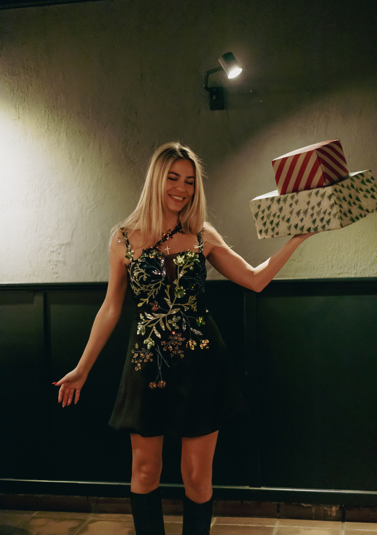 Къса коктейлна рокля в черно с класически дизайн и пищна цветна дантела, наподобяваща красотата на Висящите градини на Вавилон.