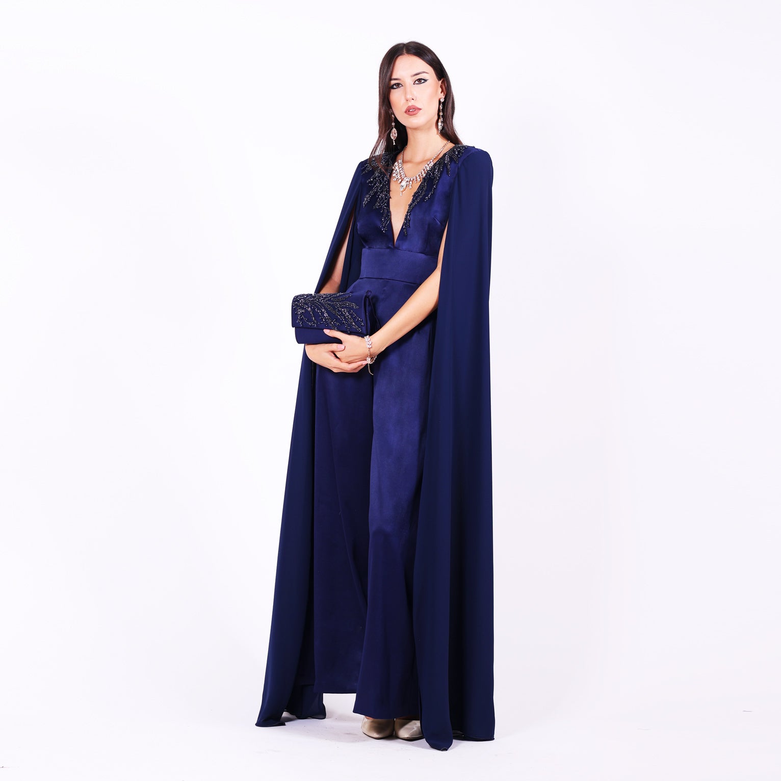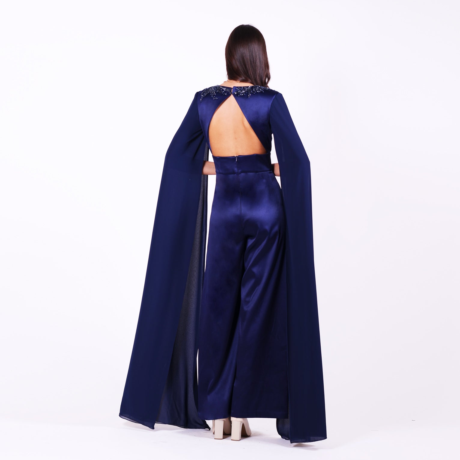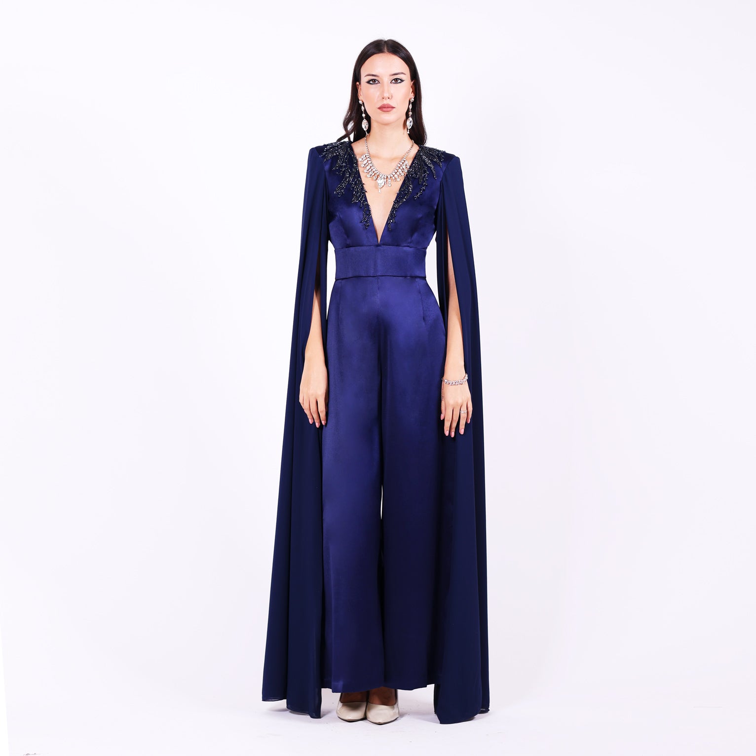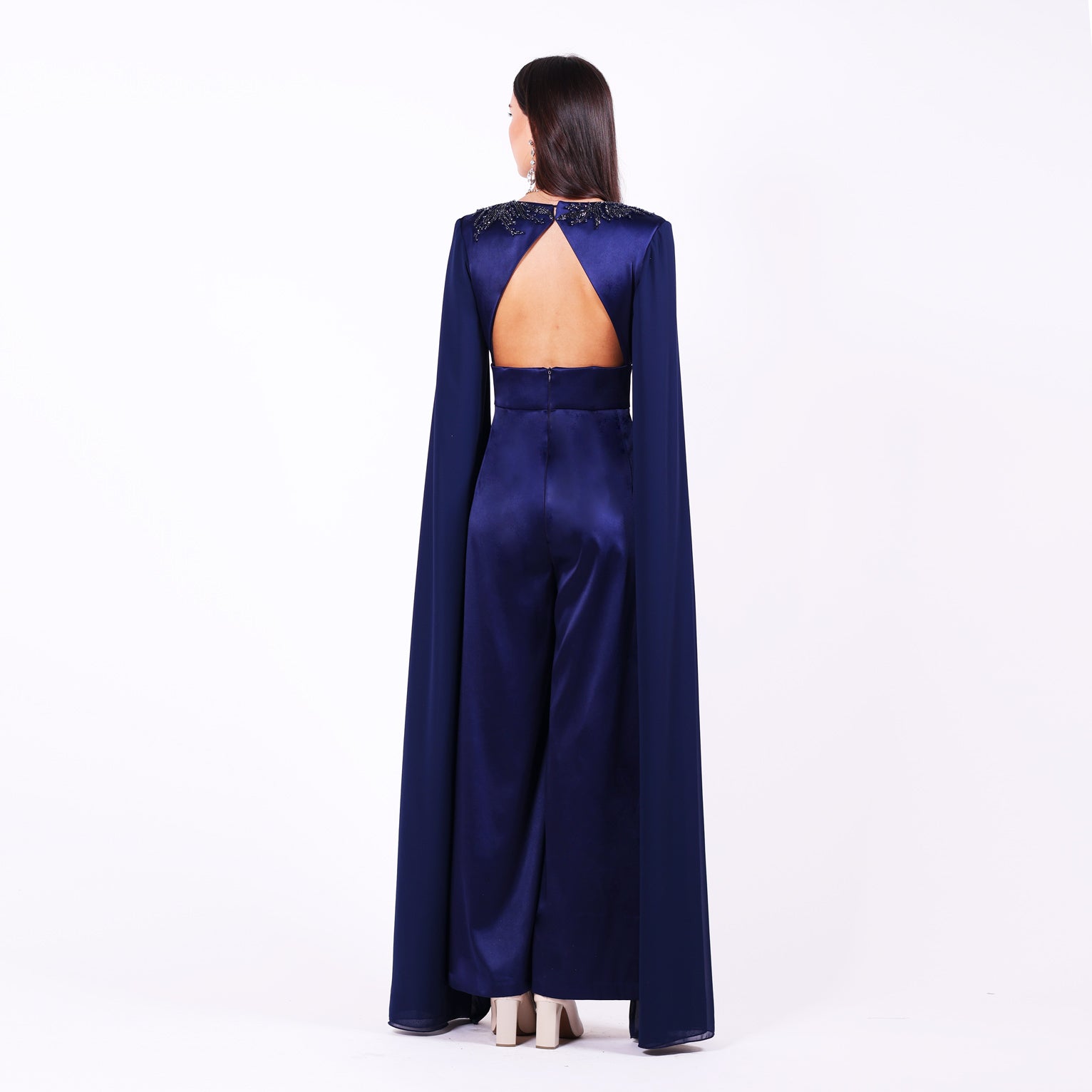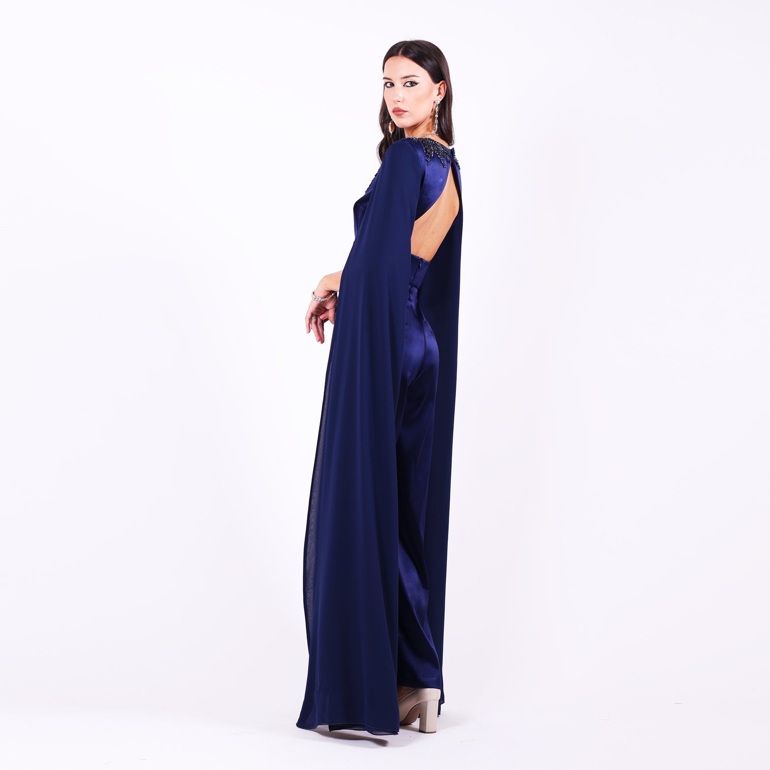 Драматичен гащеризон с V-образно деколте и елегантно изрязан гол гръб. Ефирните ръкави с дължина до земята и деликатна цепка добавят театралност и женственост към силуета. Широк колан прецизно очертава талията, а свободната, леко разкроена кройка на панталона визуално издължава силуета и придава изключително изискан вид.