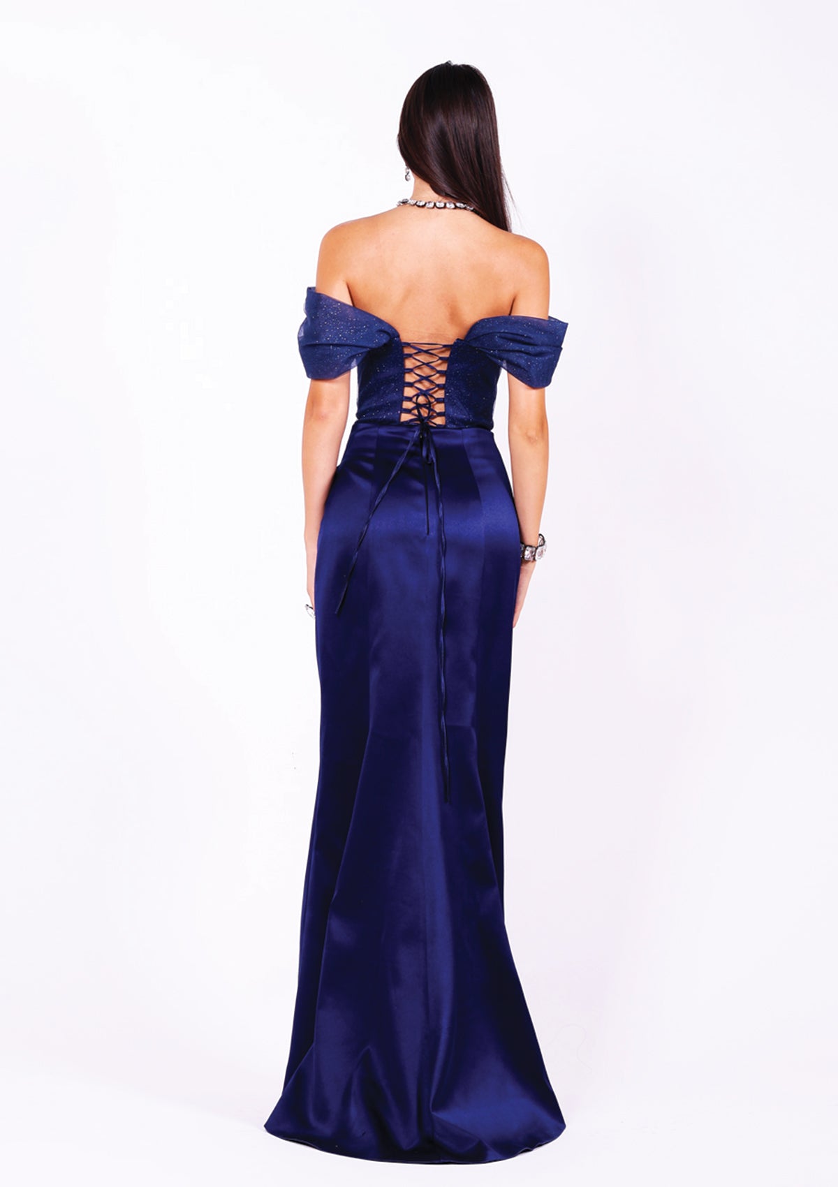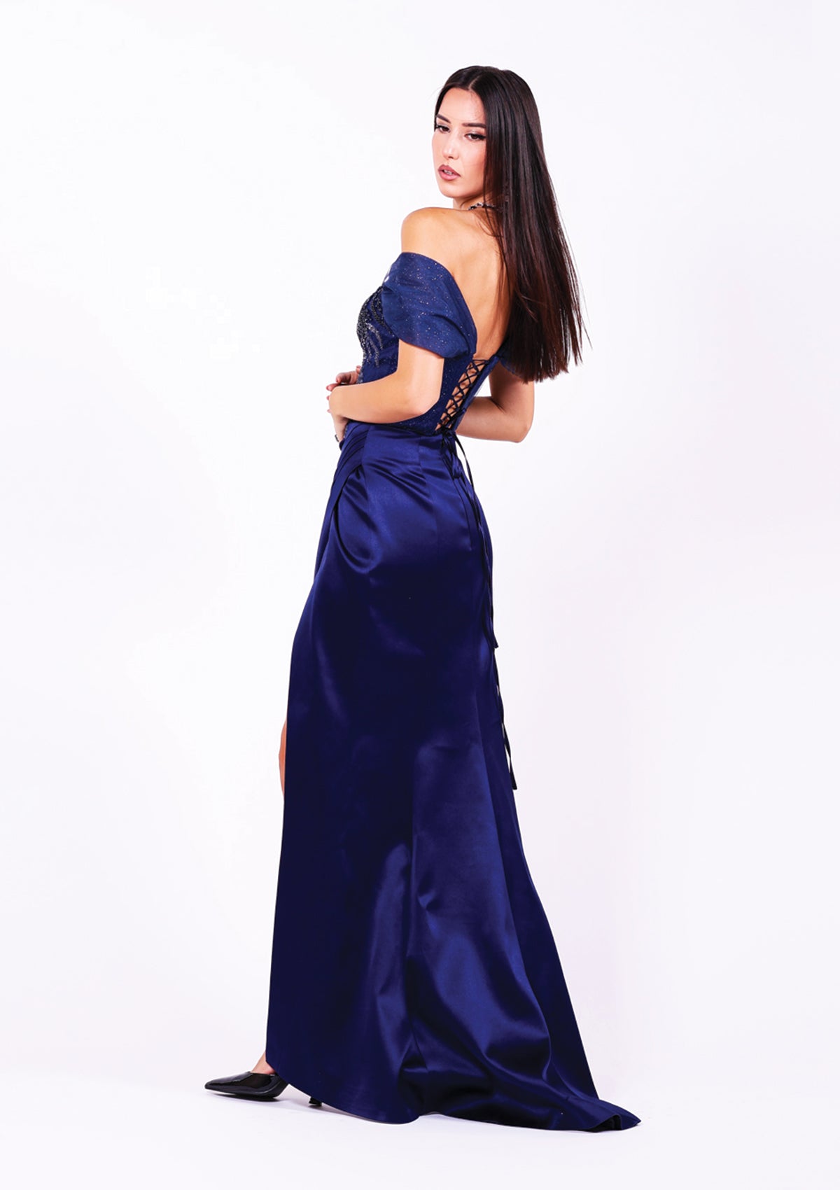 Тази елегантна сатенена рокля е създадена за дамата, която търси изящество с характер. V-образното деколте е подчертано от прозрачен панел от тюл, който нежно подчертава талията. Корсетът е обгърнат от ръчно нашита дантела с камъчета и пайети, а конструкцията му е метална - с банели и връзки на гърба. Долната част е с чупки, осигуряващи свобода и комфорт при движение. Към цялостната визия добавихме паднали ръкави, които могат да се свалят - акцент на романтика и деликатност.