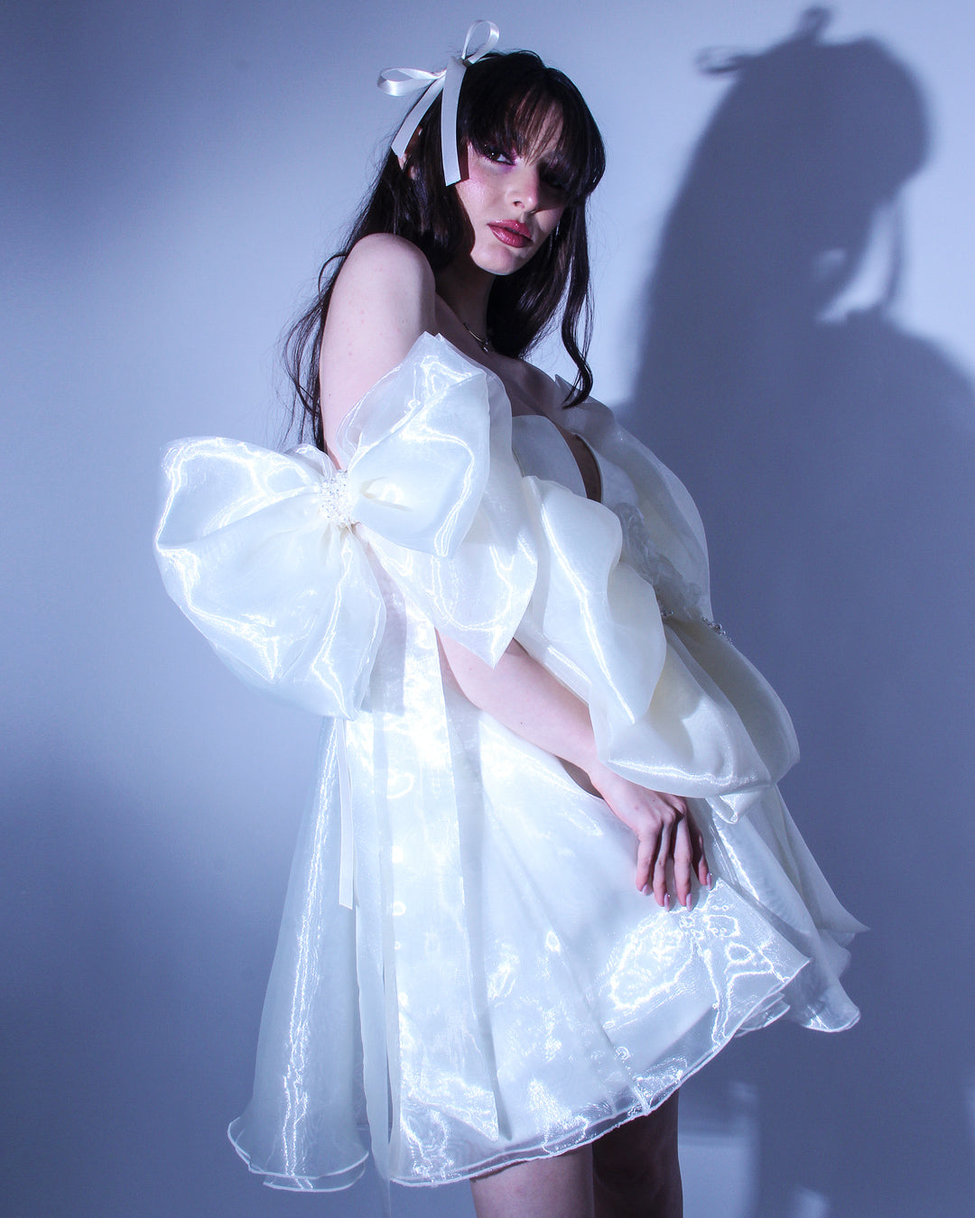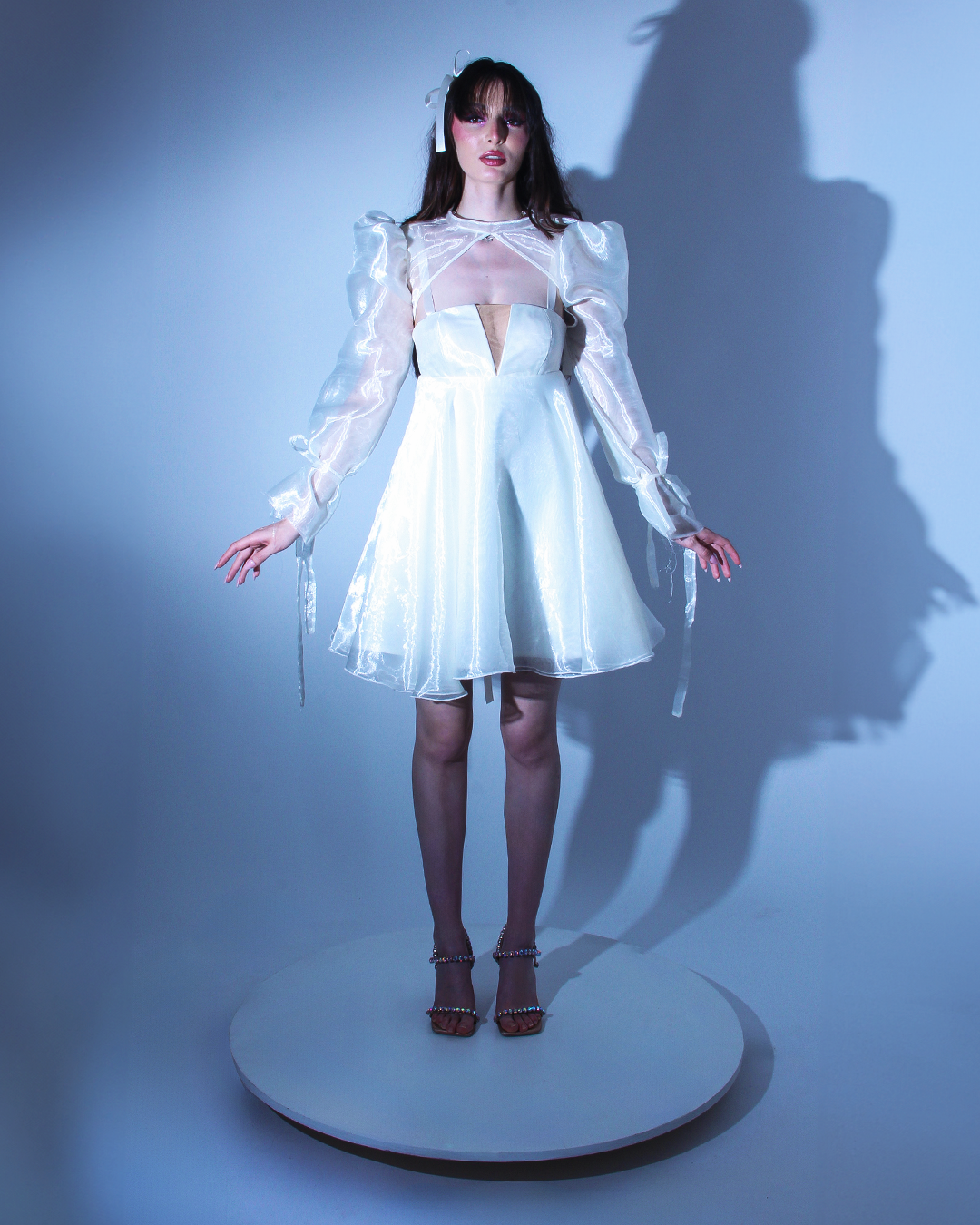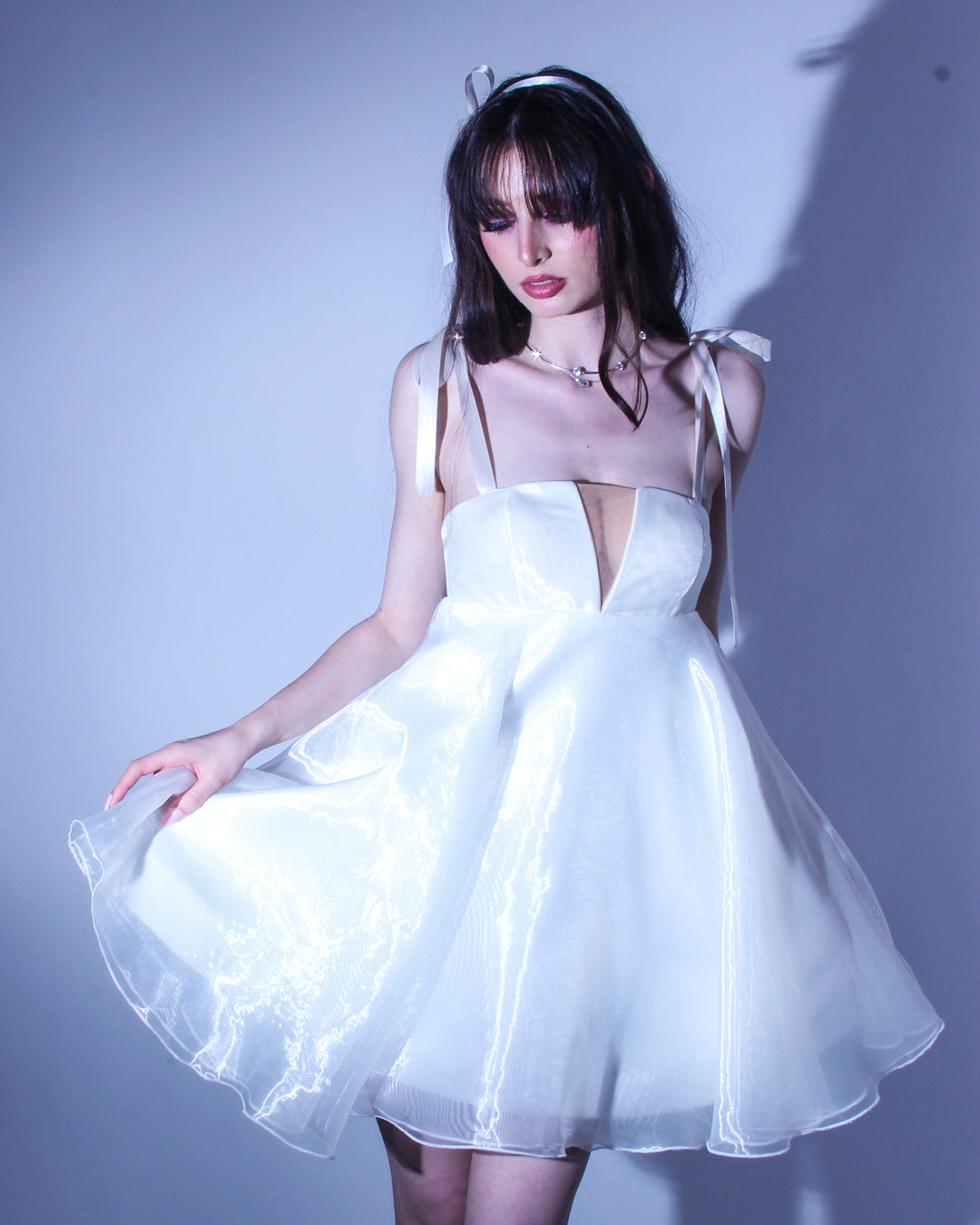 Къса принцеска рокля с V-образно деколте и фин панел от тюл, който подчертава талията и придава елегантна структура на силуета. Горната част е изчистена, но ефектна, а долната част пада свободно и обемно, изработена в комбинация от сатен и органза, които създават ефирност и лекота при движение.
