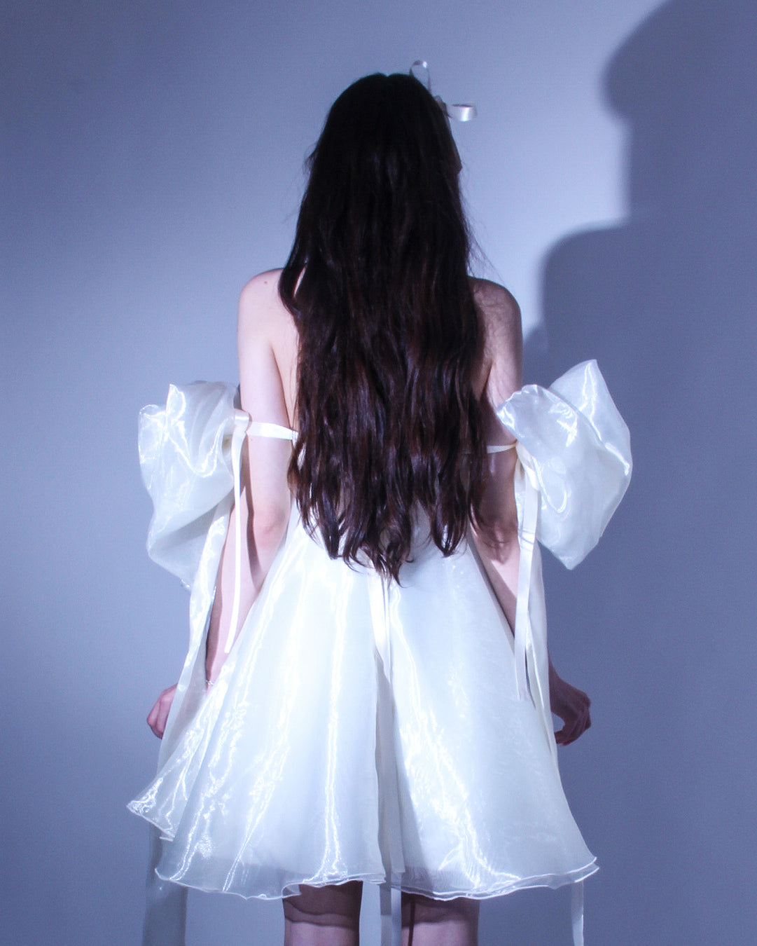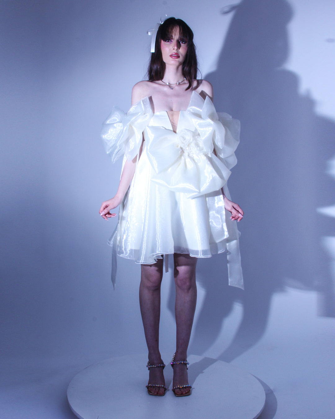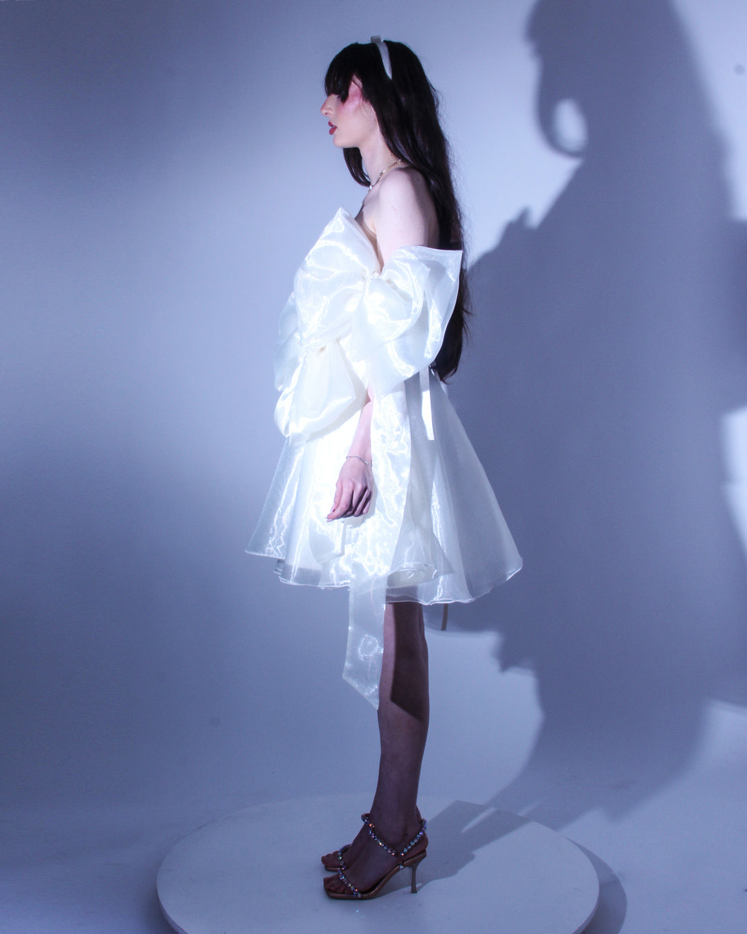 Къса принцеска рокля с V-образно деколте и фин панел от тюл, който подчертава талията и придава елегантна структура на силуета. Горната част е изчистена, но ефектна, а долната част пада свободно и обемно, изработена в комбинация от сатен и органза, които създават ефирност и лекота при движение.