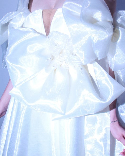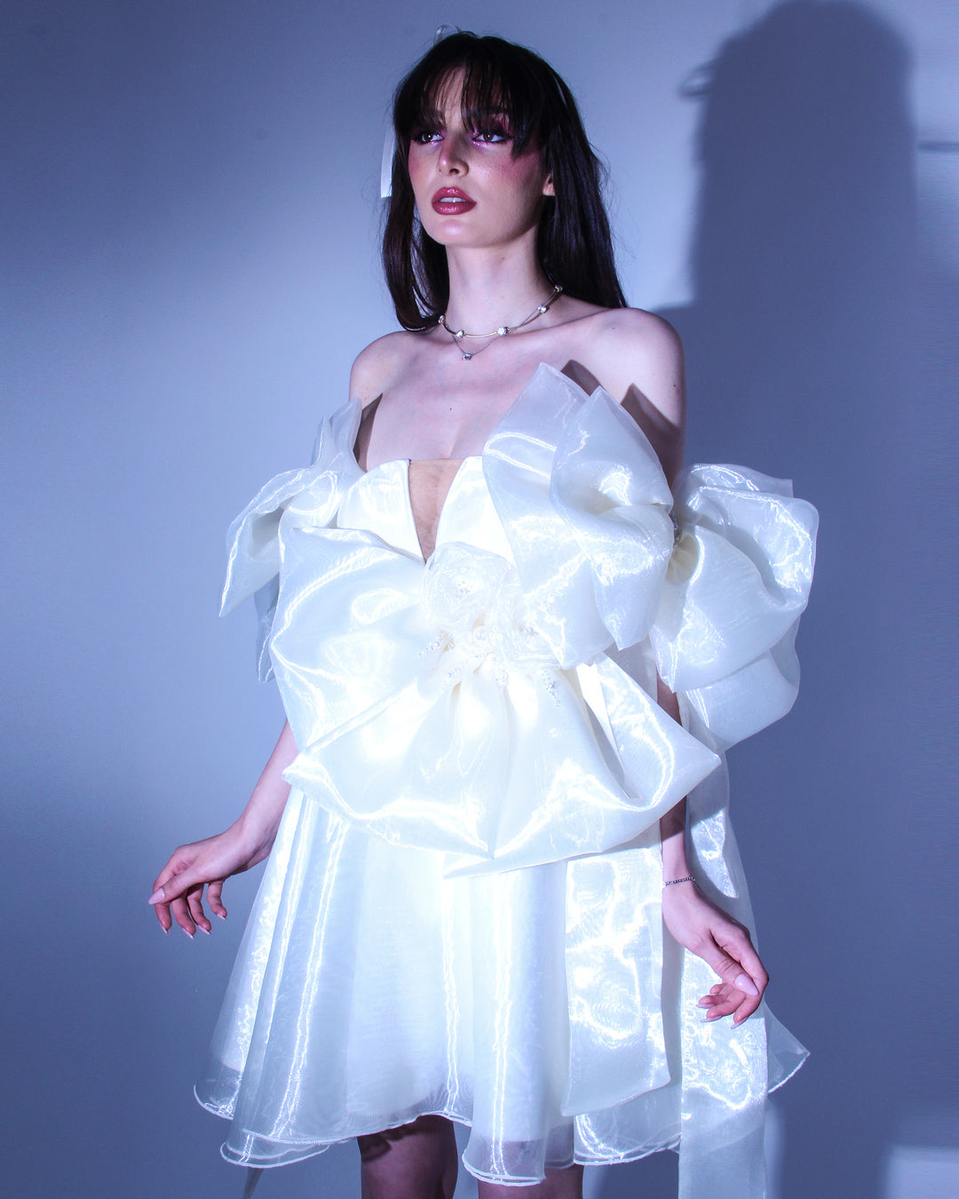 Ръчно изработено цвете от нежна органза, декорирано с фини перли. Подходящо допълнение към булчинска рокля, официална визия или романтичен акцент в абитуриентска рокля.