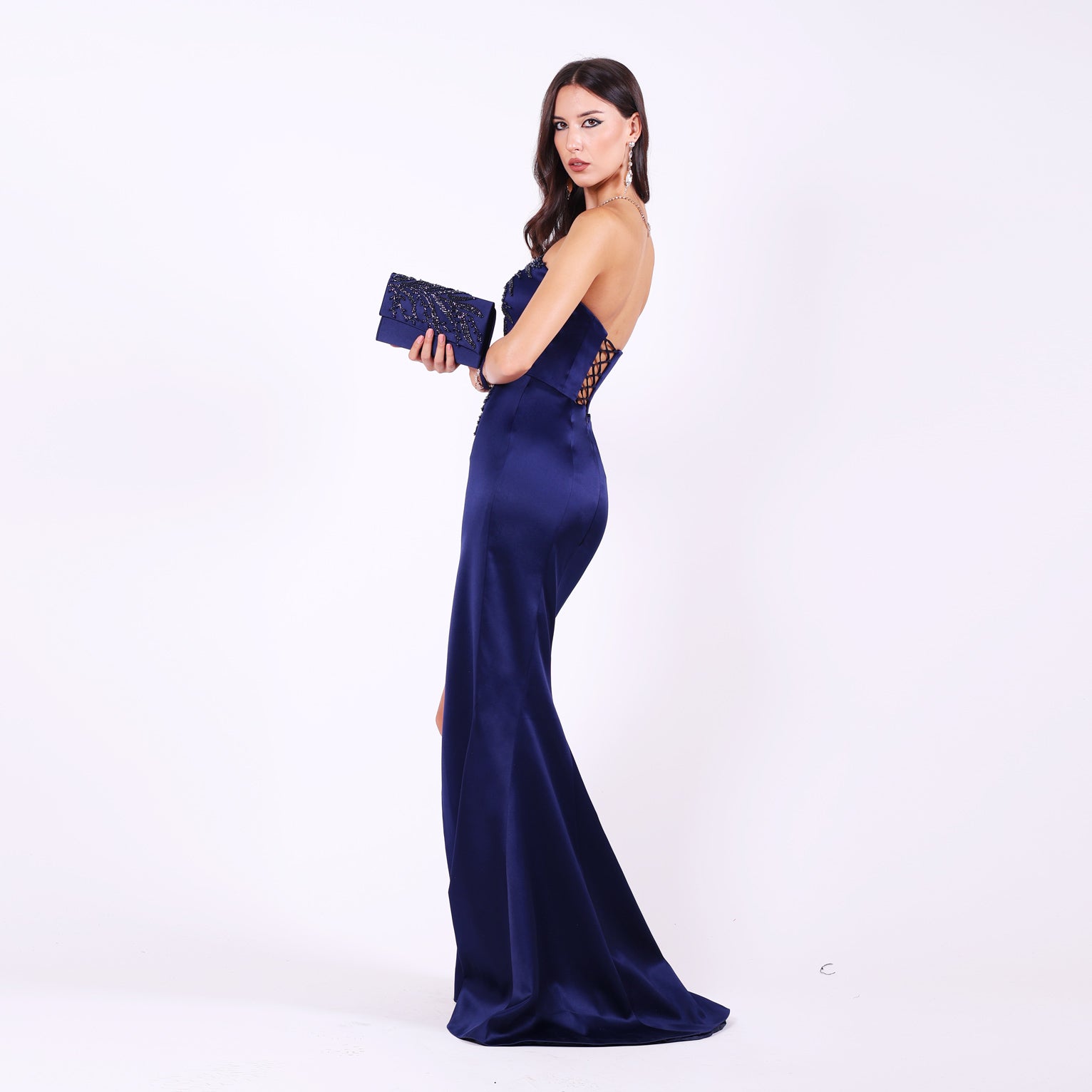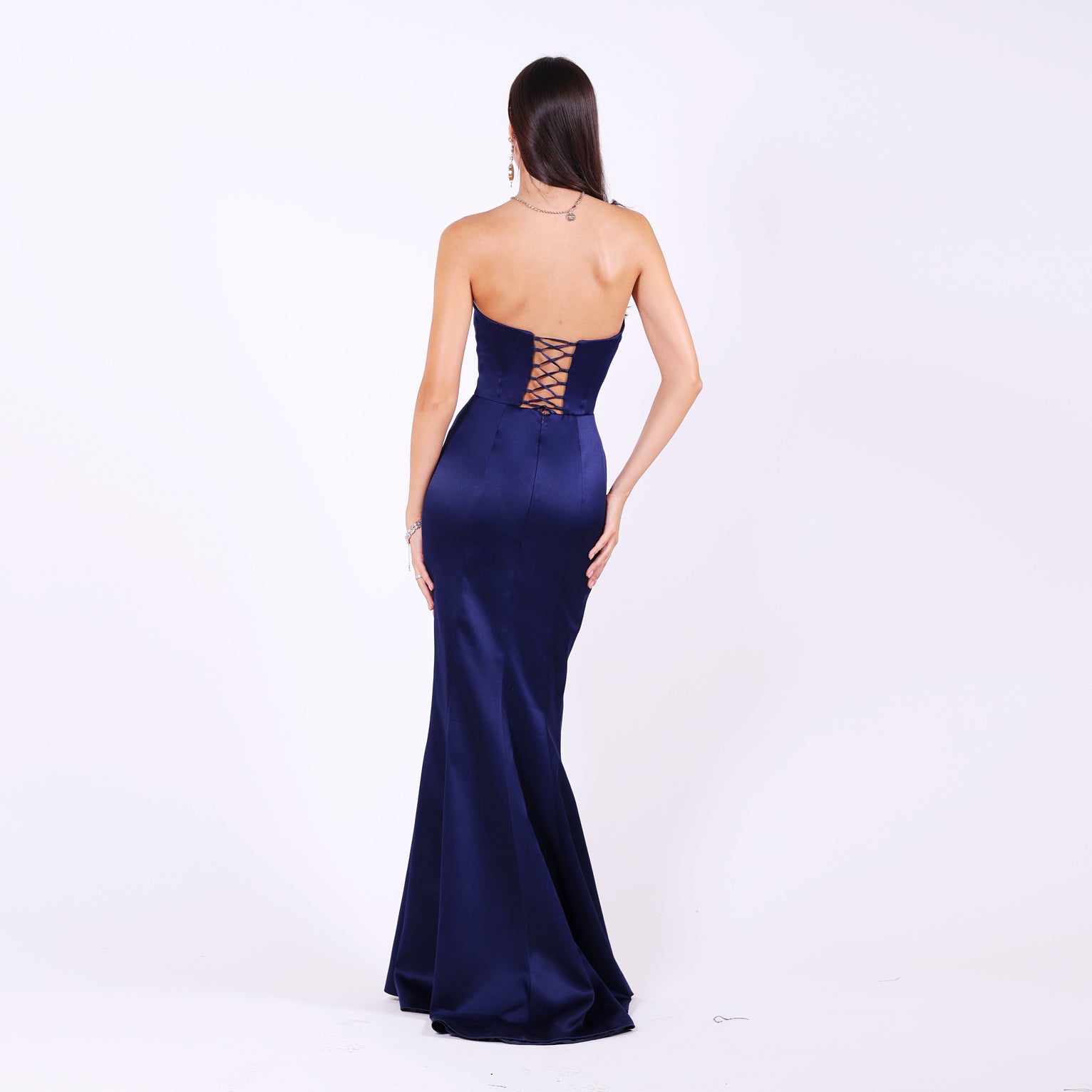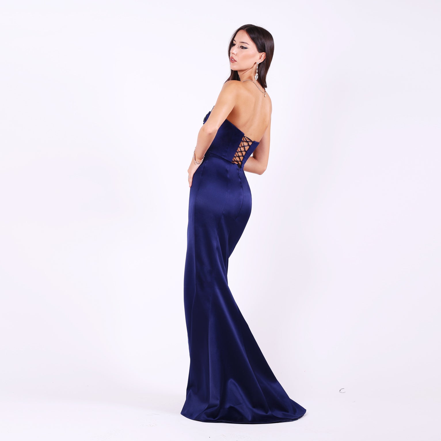Официална рокля с V-образно деколте и фин тюлен панел, който подчертава талията и придава лекота на силуета. Горната част е корсетирана с метални банели, чашки и взърки на гърба, осигуряващи перфектно прилягане. Корсетът е обгърнат с рачно нашита дантела, покрита с камъчета, създаващи изящен блясък. Долната част е с кройка тип "русалка" и елегантна права цепка, подчертаваща женствеността.
