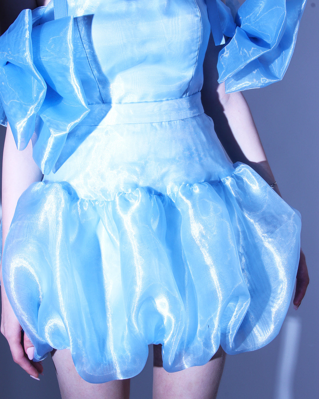 Като излязла от приказка, тази кокетна къса пола с драматичен обем и балон-силует съчетава игривост и елегантност в едно вълшебно творение. Перфектна за онези незабравими мигове, когато искаш да бъдеш под прожекторите на вечерта.