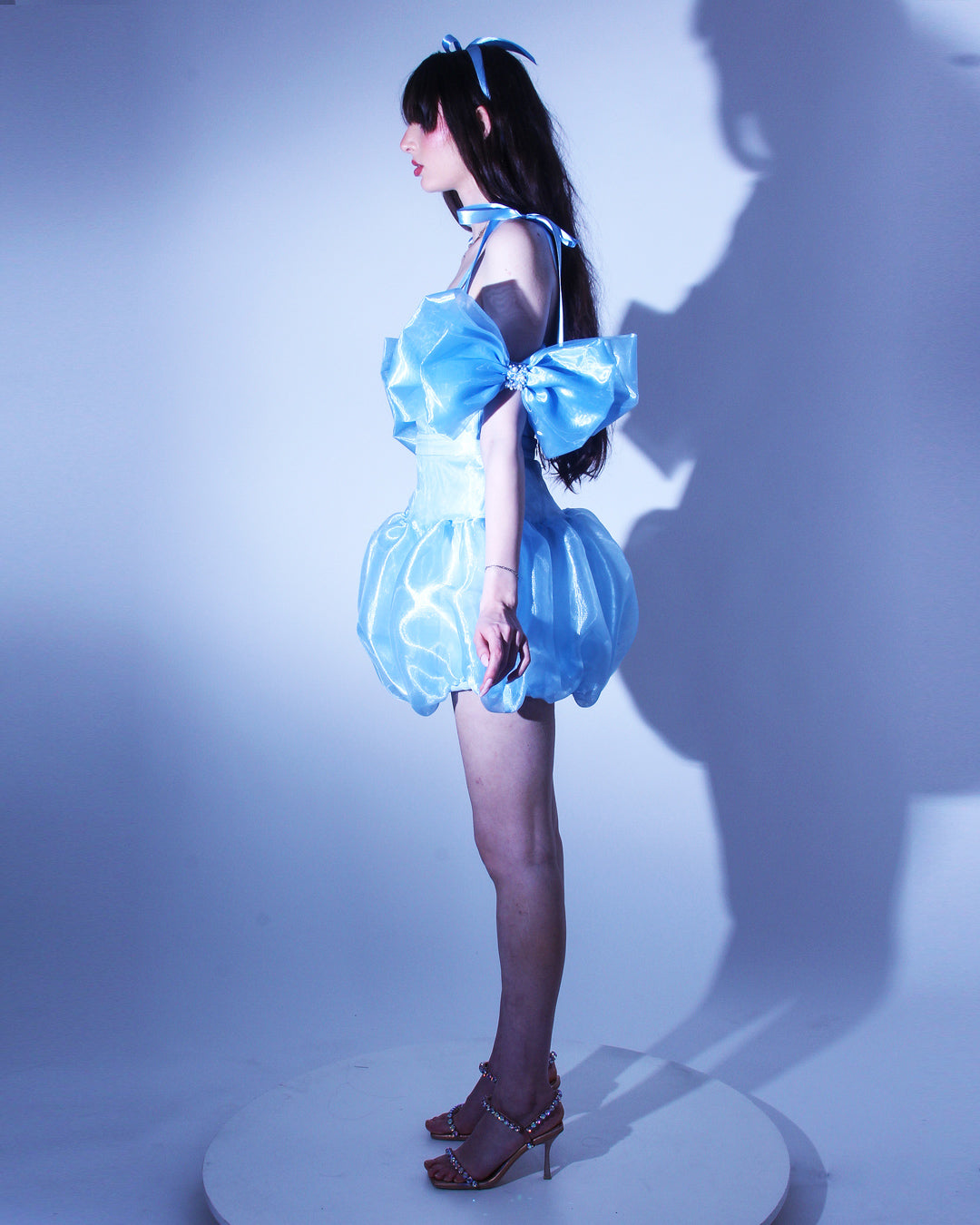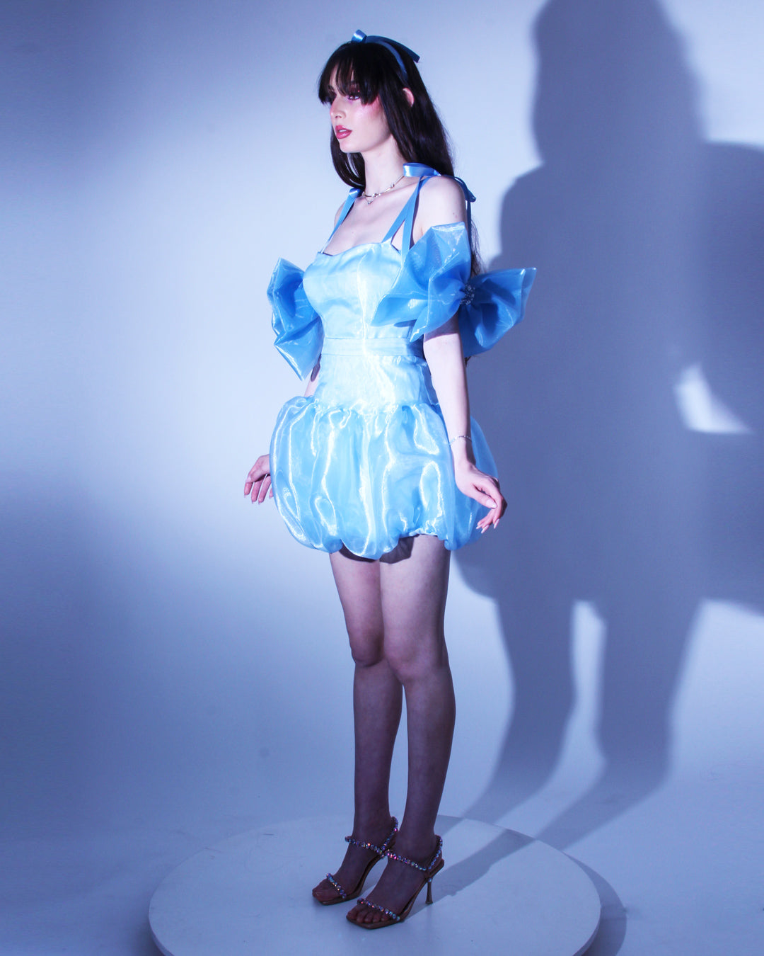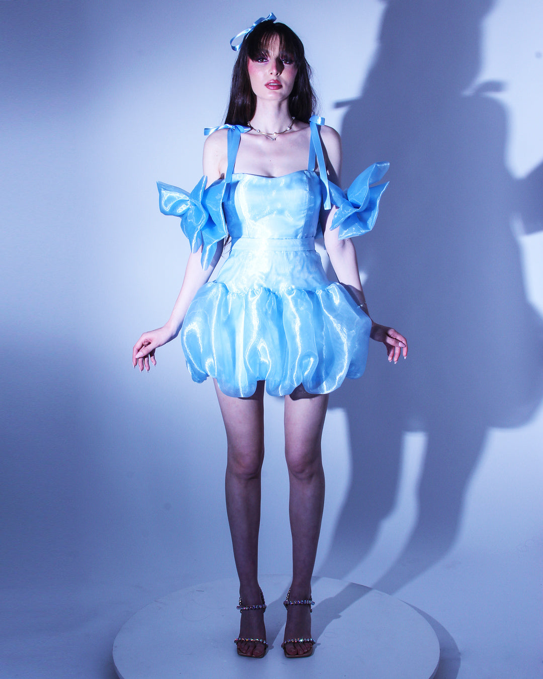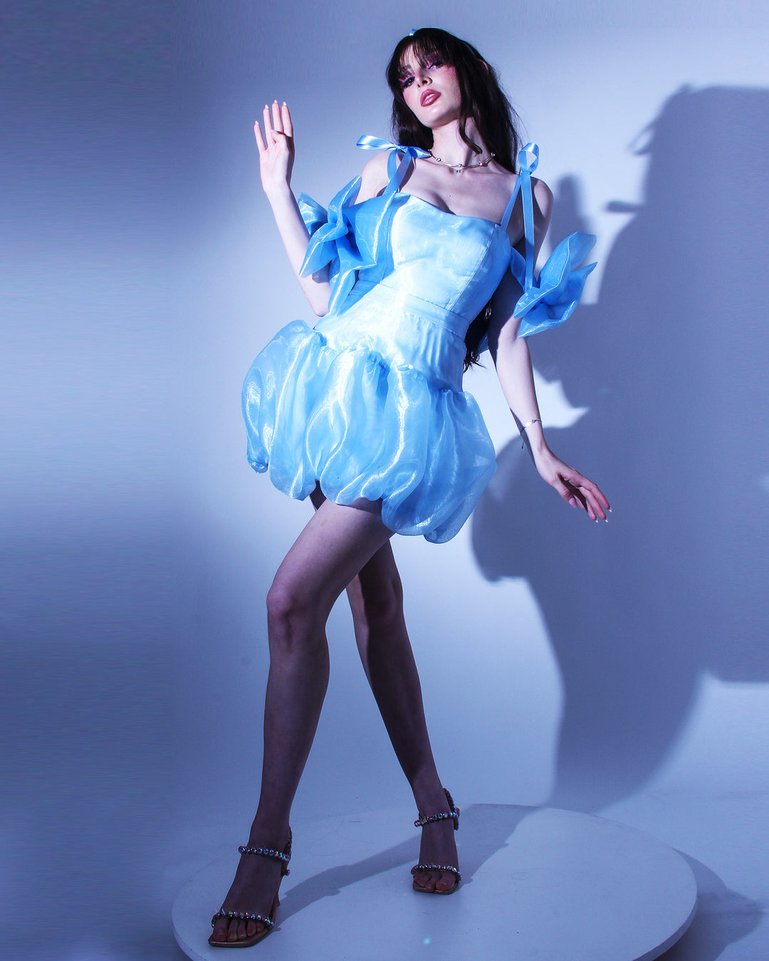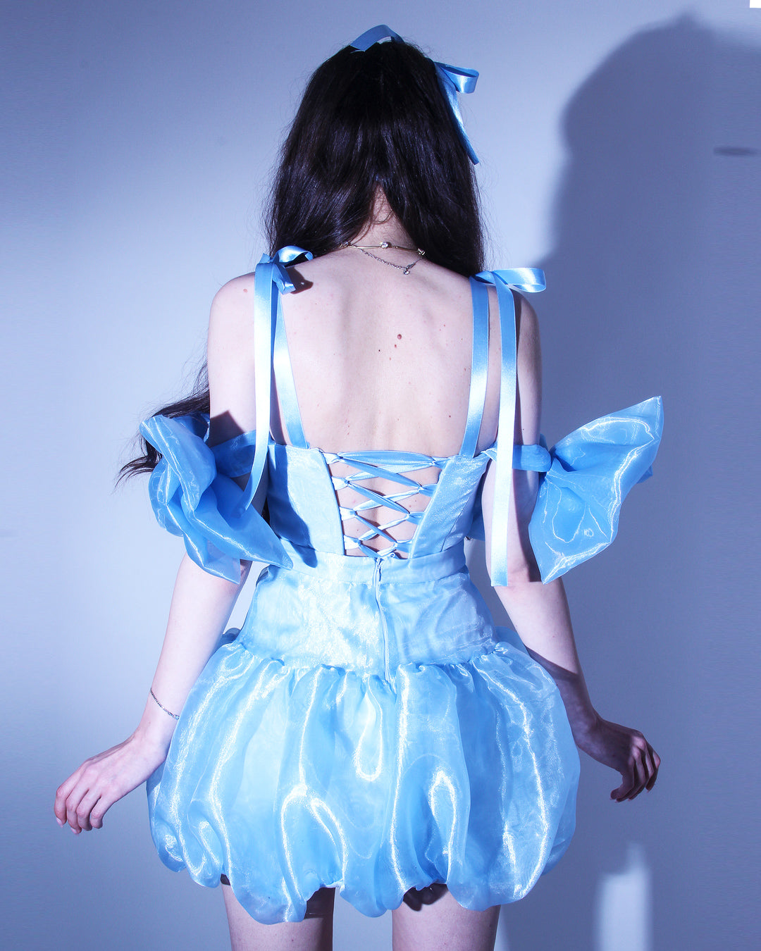 Кокетна къса синя рокля с драматична долна част тип бало - модерен прочит на класическата официална рокля. Горната част е корсетирана, с вградни метални банели и връзки на гърба, които осигуряват перфектно прилягане към тялото и карсиво оформен силует.
