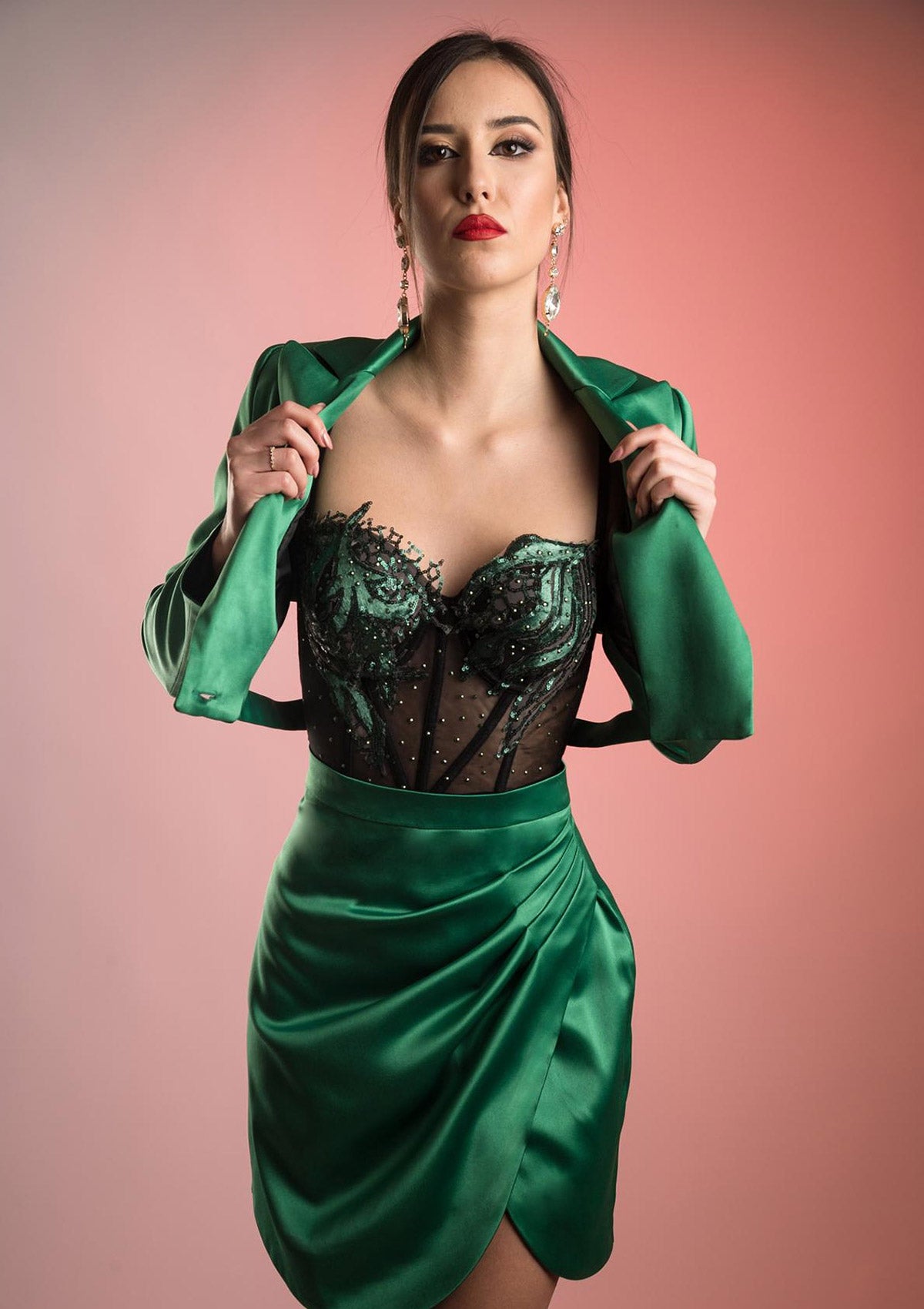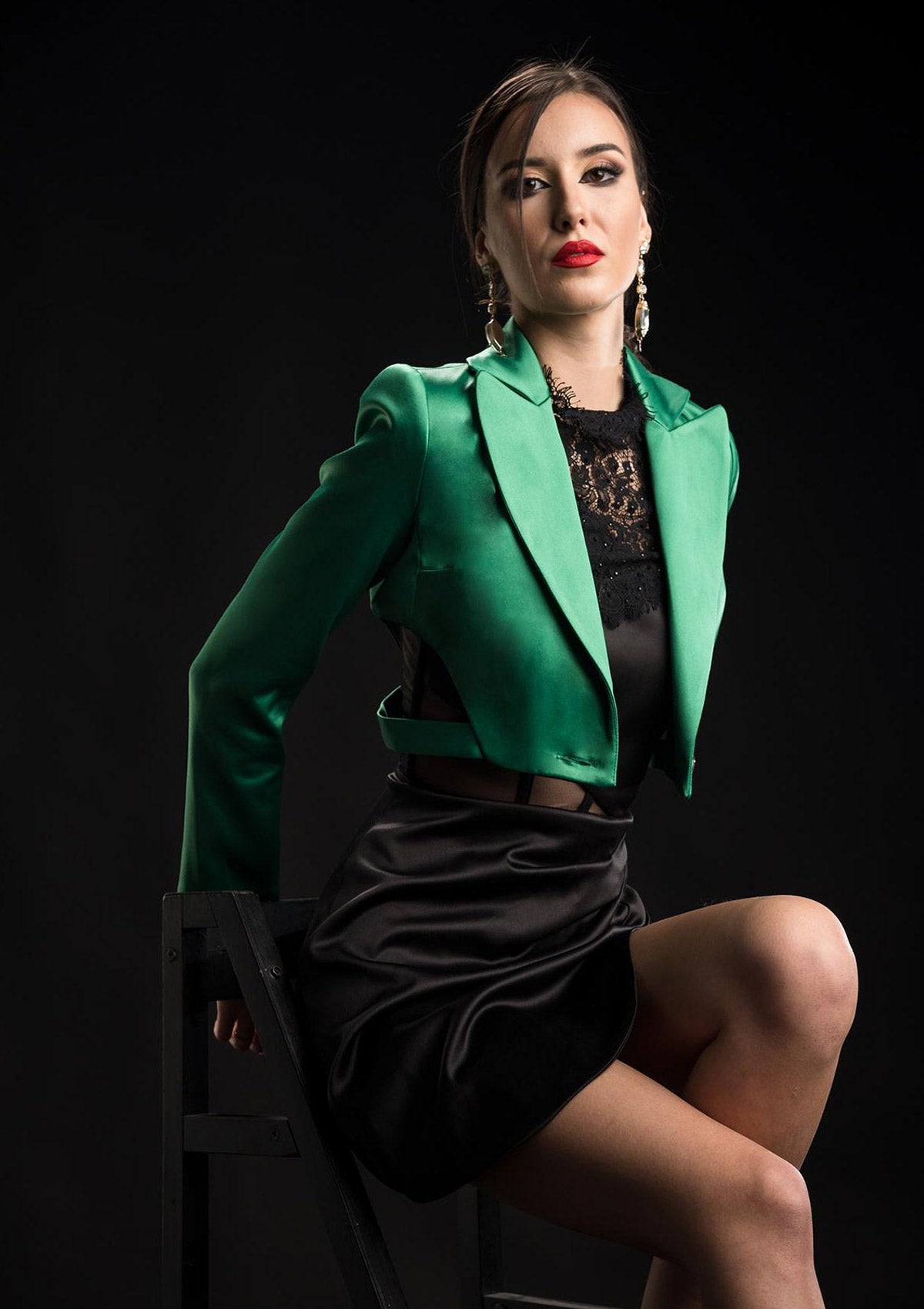 Късо официално сако с ревер и изрязани детайли, които подчертават талията и оставят бунтарски привкус. Идеален завършек към официална визия с абитуриентска рокля.