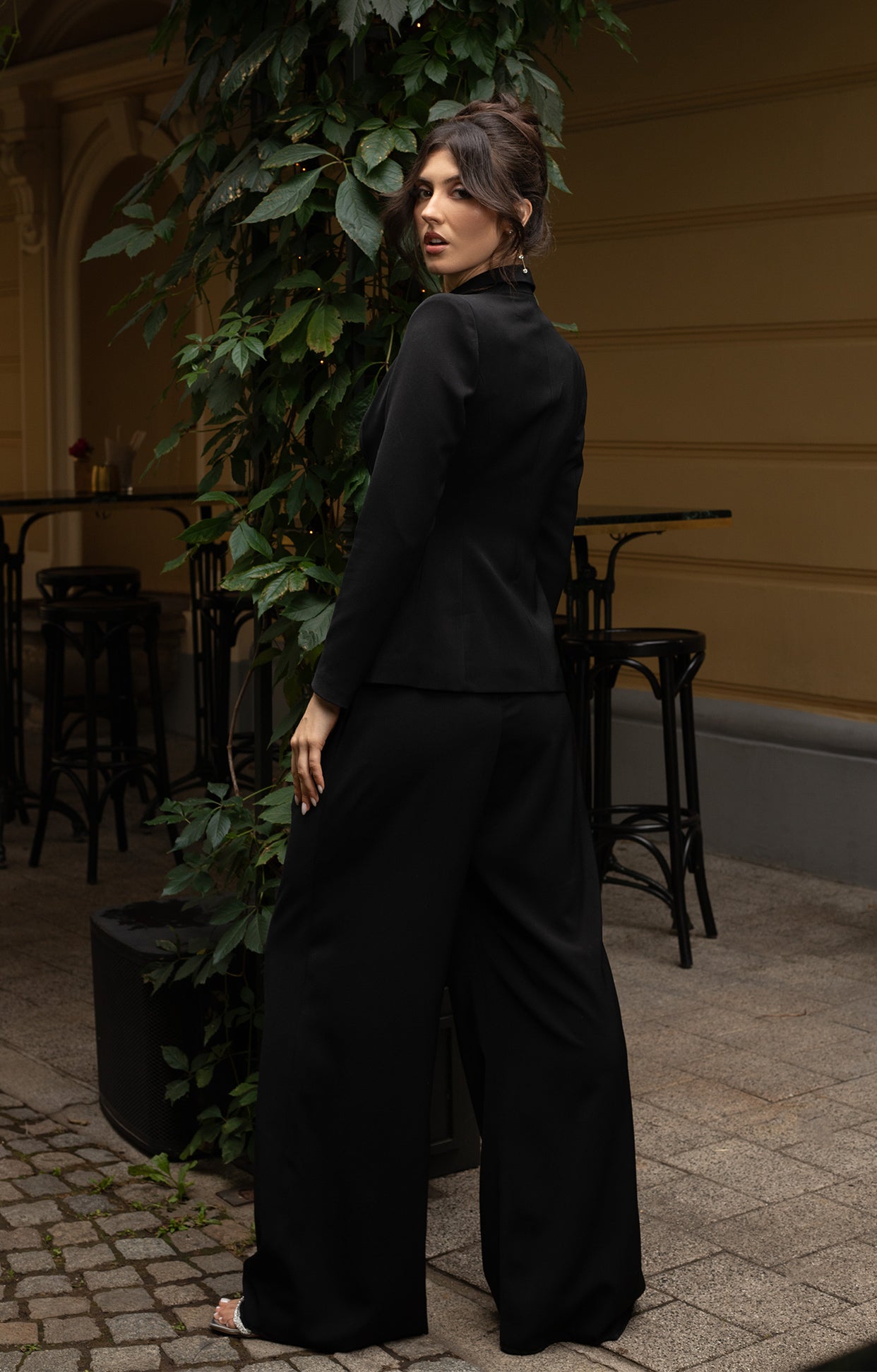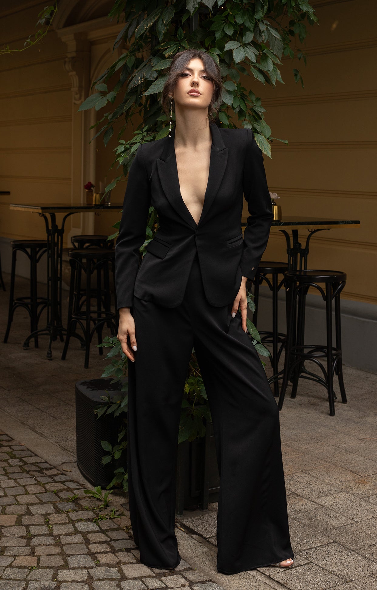 Дълго официално Noire сако в класическо черно, създадено да подчертае увереността и стила на жената. Сакото е изработено с изчистена кройка и безупречна линия, която приляга към тялото и оформя силуета. Дълбокото V-образно деколте внася модерен акцент и придава дръзко, но същевременно изискано излъчване. Фините детайли като прецизните ревери и джобовете с капаци допълват цялостната визия, като съчетават функционалност и стил.