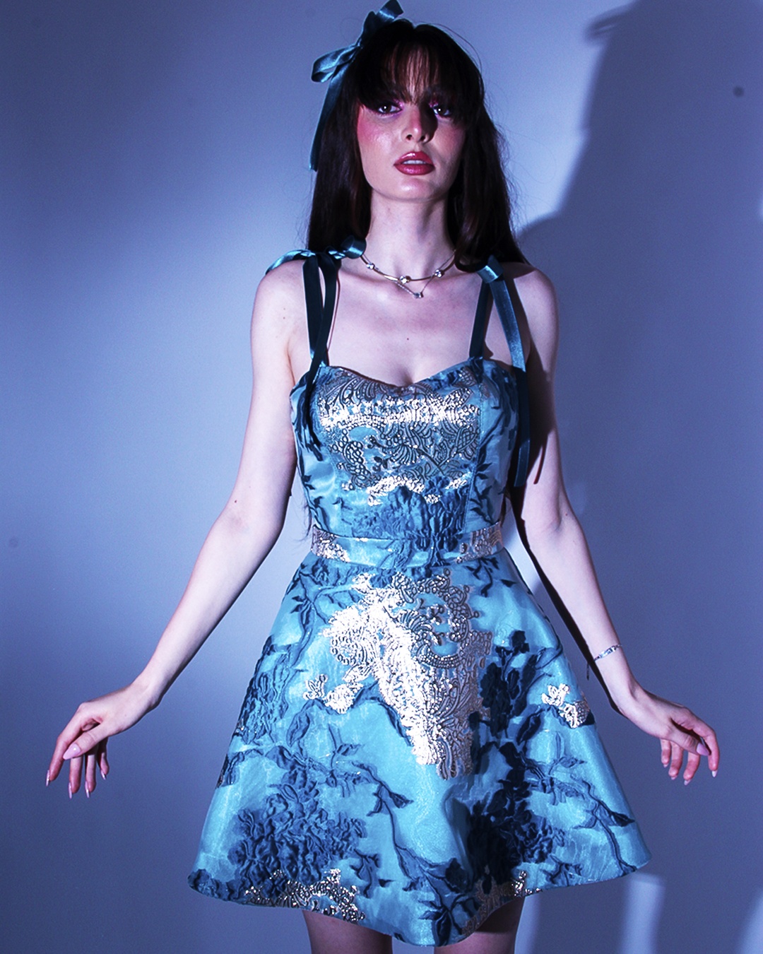 Кокетна къса обемна пола с класически силует, изработена от луксозен жакардов материал с деликатна текстура. Подходяща за създаване на модерна визия - Може да бъде комбинирана с корсет или друг вид горна част за по-различна алтернатива на официална рокля, или като част от впечатляваща абитуриентска рокля.