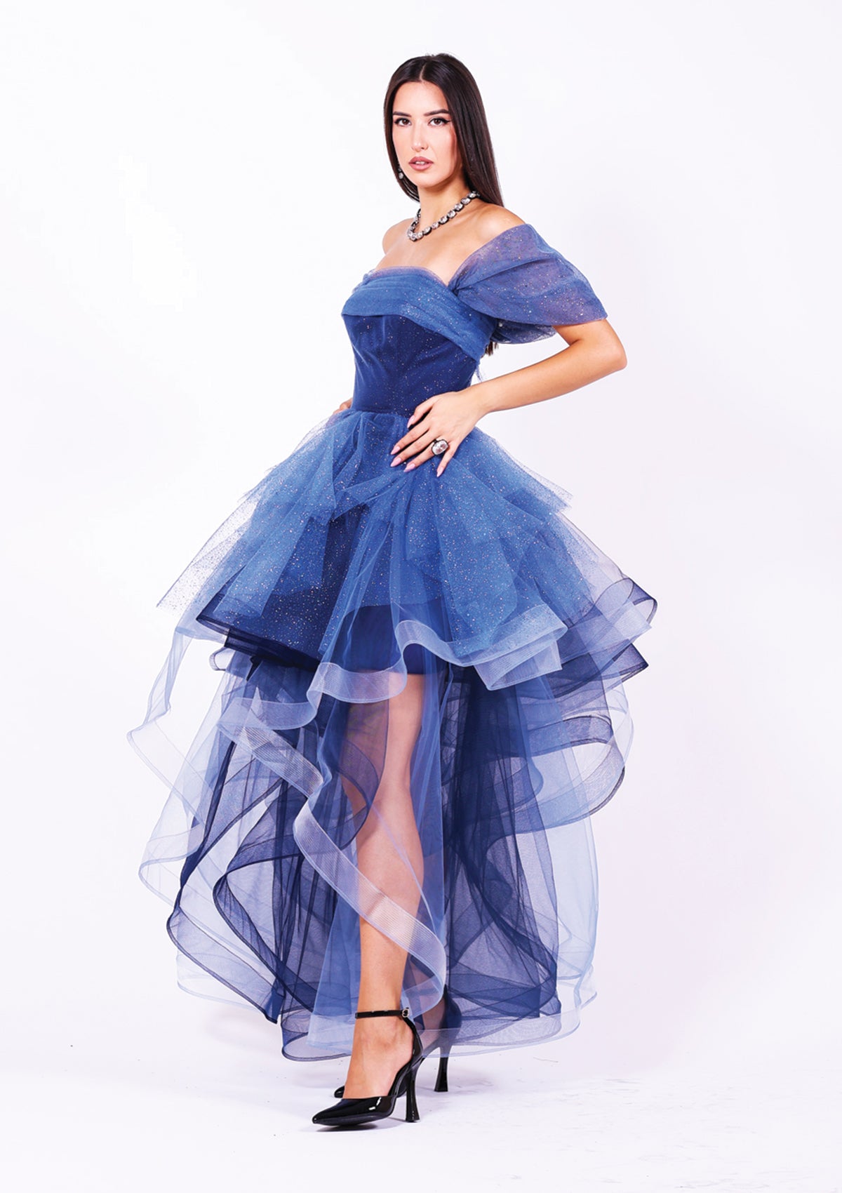 Рокля Sapphire е като морска буря, уловена в движение - с многобройни слоеве тюл в нежни и наситени нюанси на синьото, които меланжират. Горната част е право деколте с допълнително набран брокатен тюл за деликатен блясък. Създадохме и паднали ръкави от красив син брокат, които могат да се свалят - за преобразяване между класика и свобода.