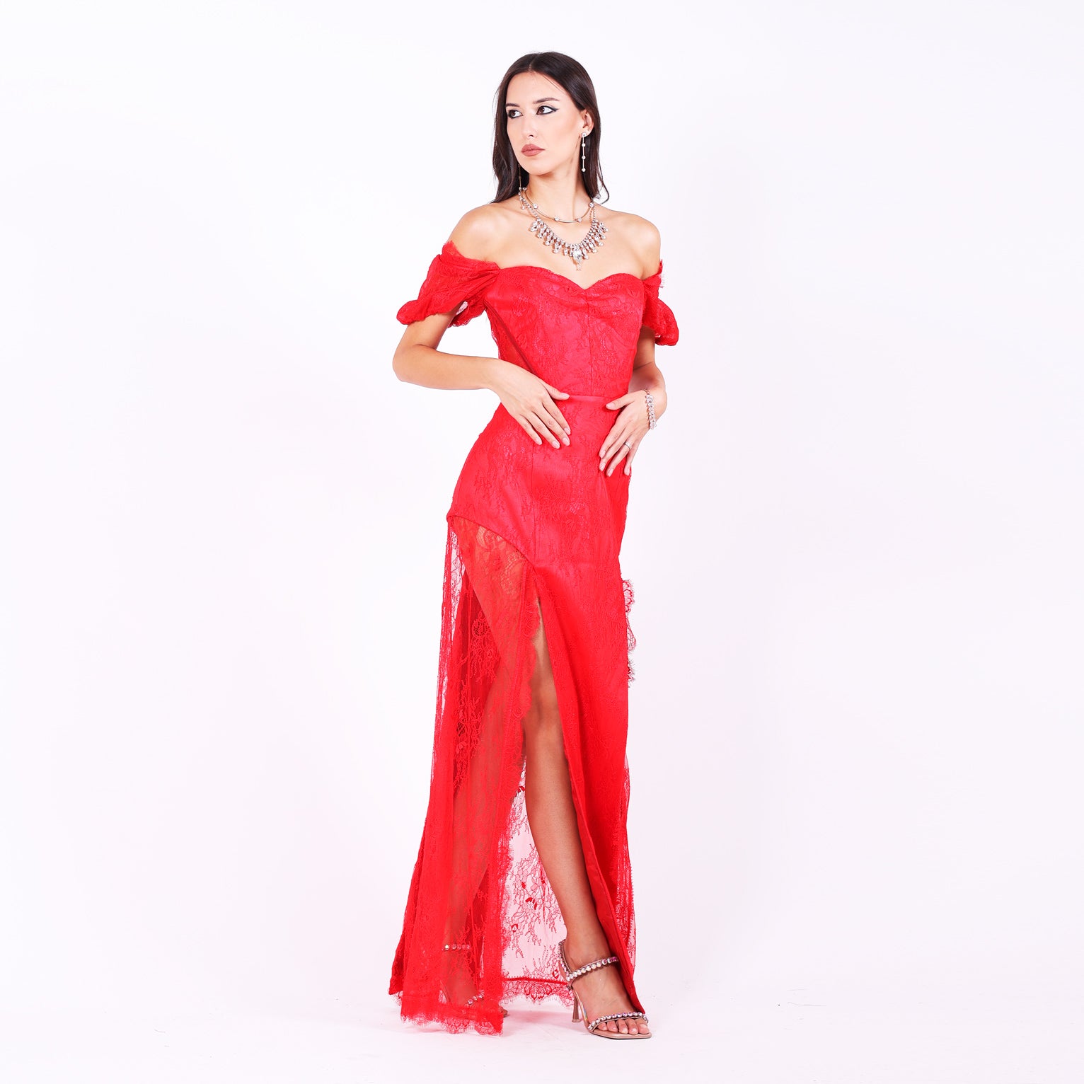 Огнено червена рокля с елегантни паднали ръкави и изящна дантела на гърба, която придава чувствена мекота на цялостната визия. Корсетът е със сърцевидно деколте, метални банели и връзки на гърба, оформящи силуета прецизно и деликатно. Полупрозрачните панели около талията допълват конструкцията и акцентират върху линията на тялото с фин баланс между класика и модерна дързост.