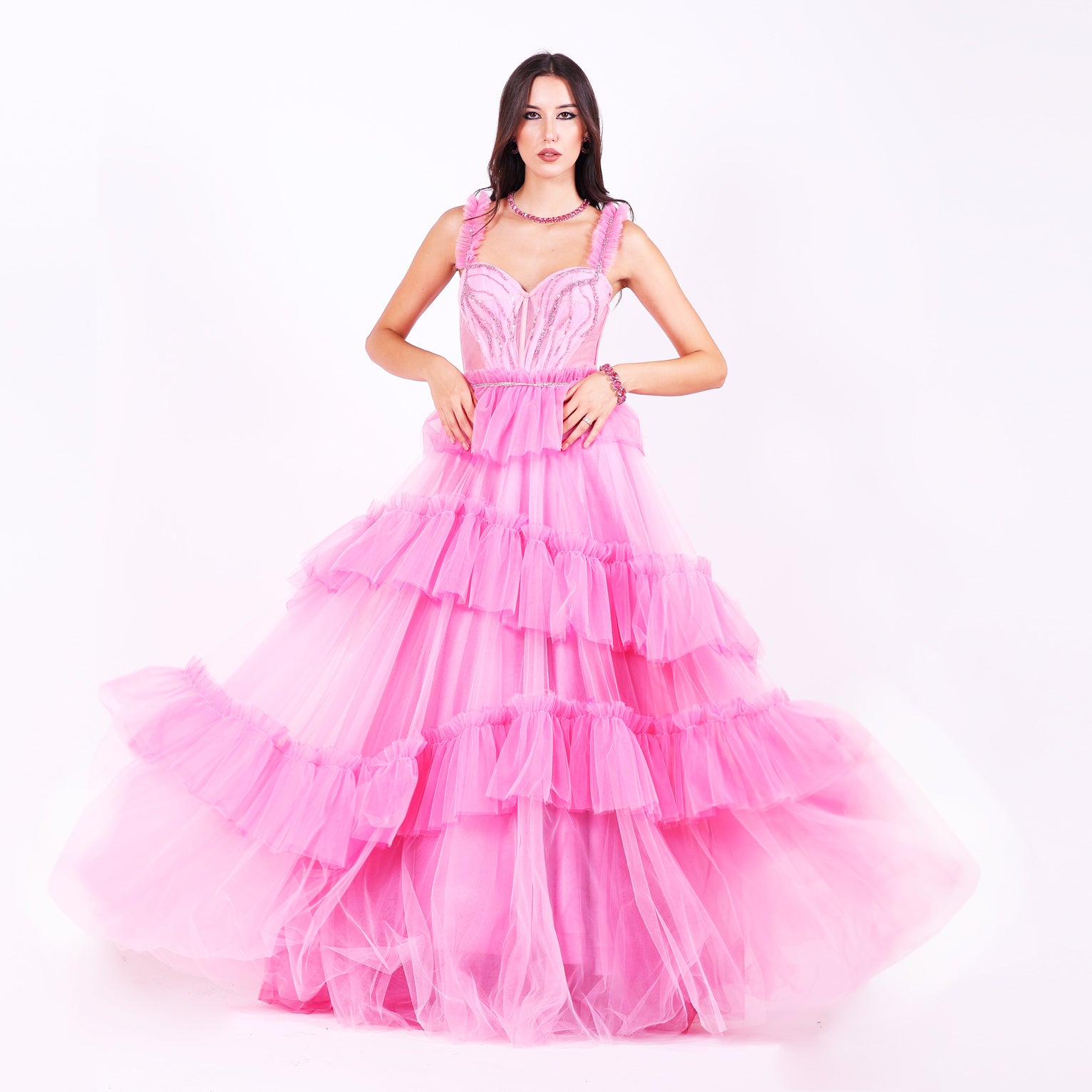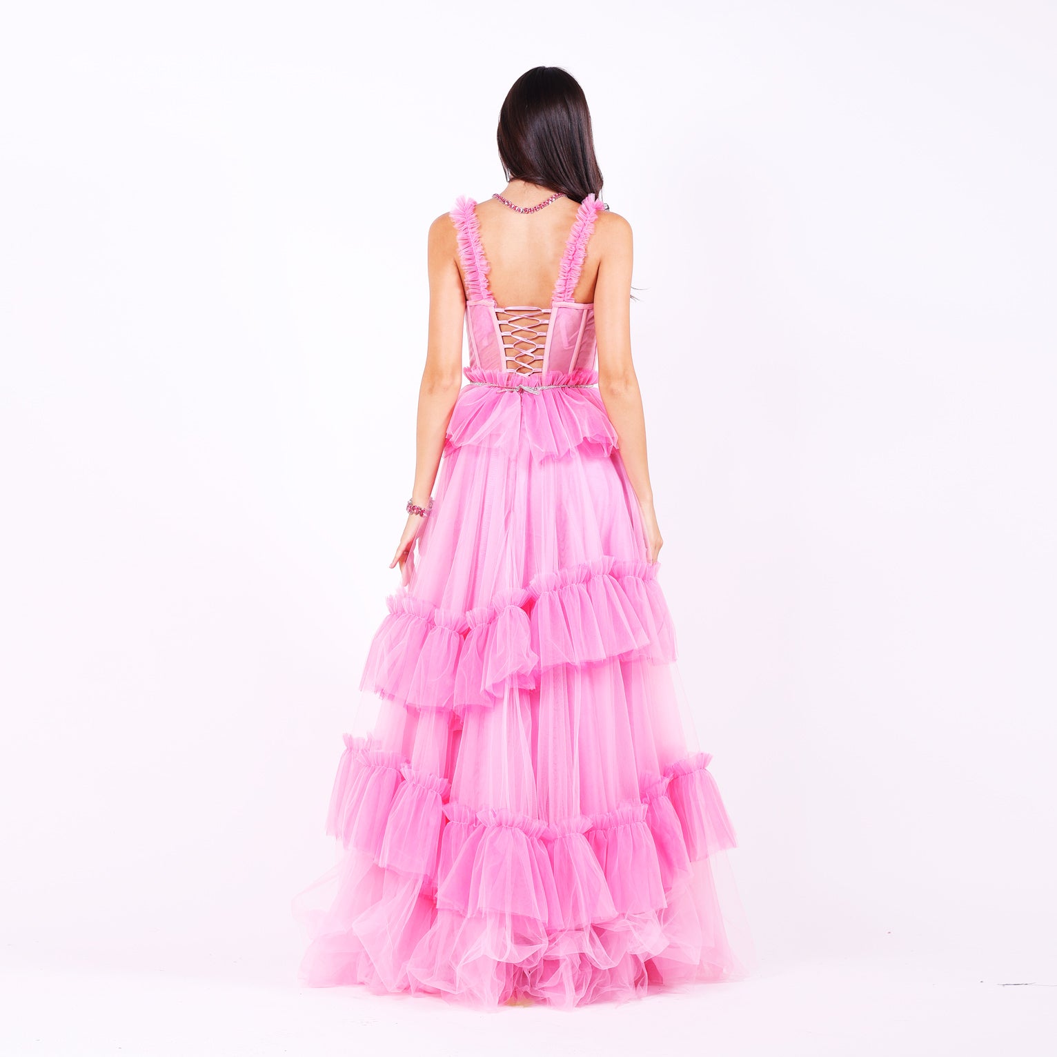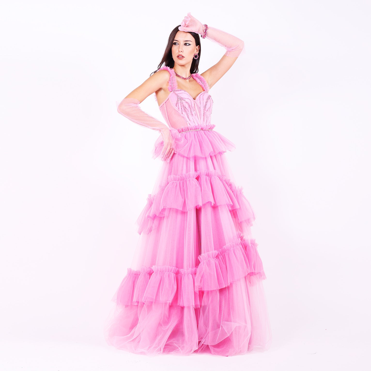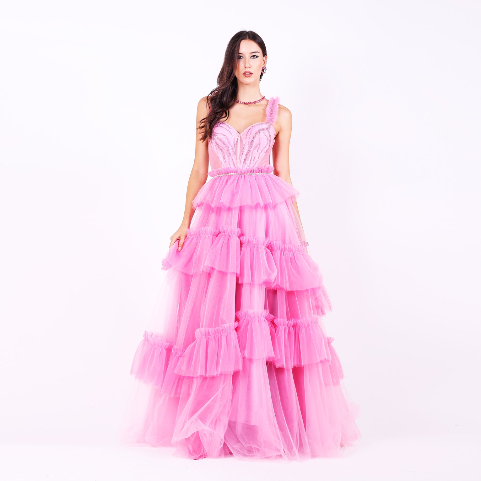 Екстравагантна официална рокля с драматични асиметрични къдрици от тюл, подчертанаци с ръчно нашита дантела, покрита с фини камъни. Горната част е корсет с чашки, метални банели и връзки на гърба, които оформят силуета и придават стабилност.