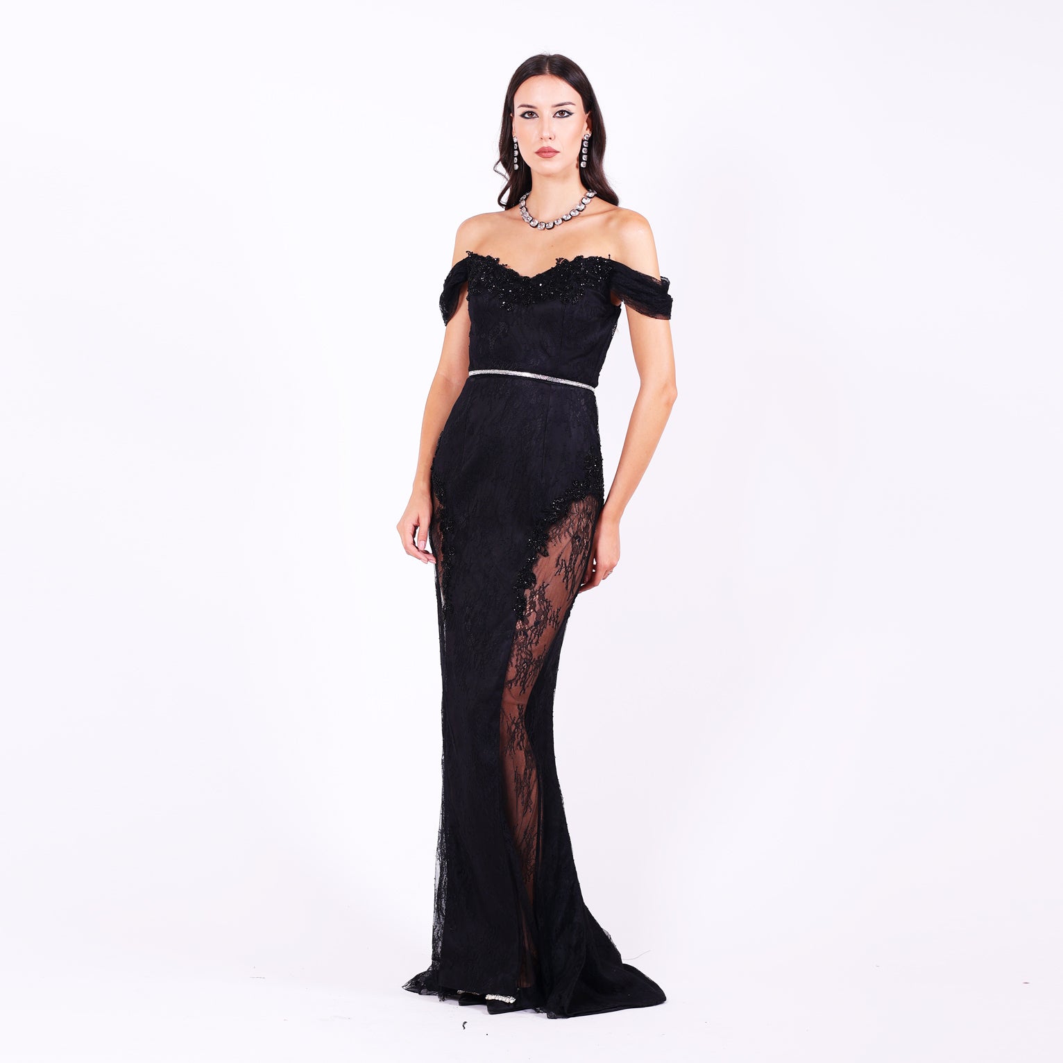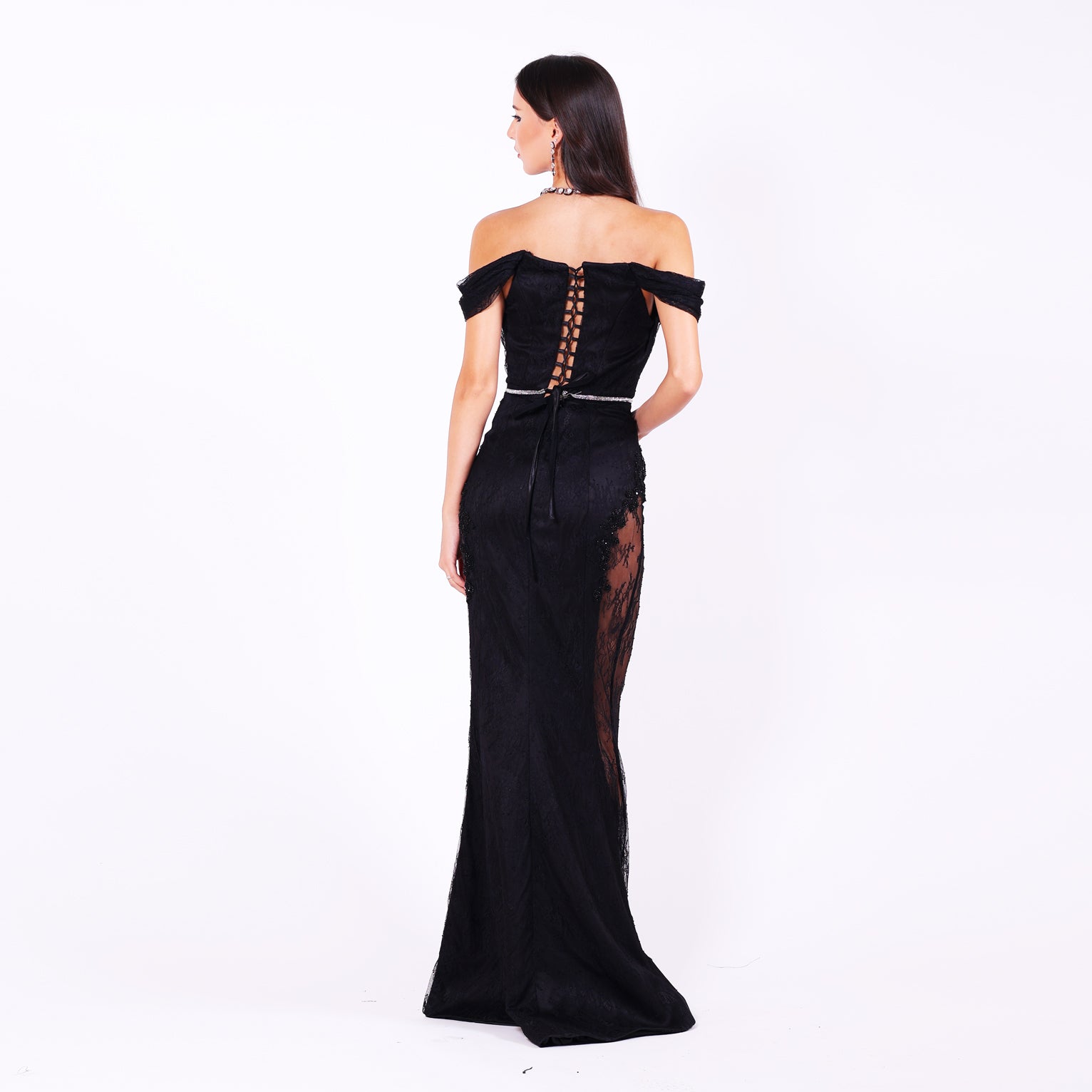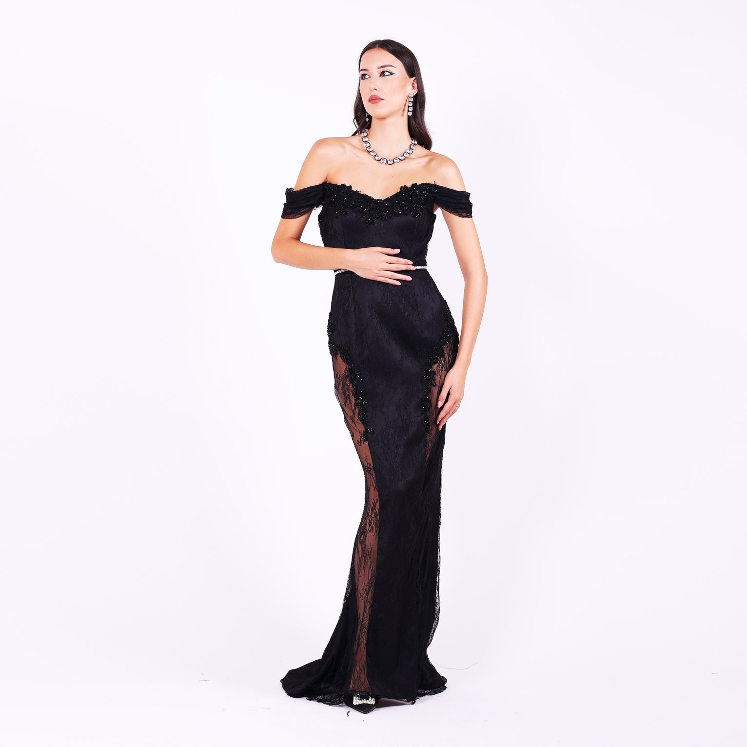 Официална рокля, създадена за погледи, които не се откъсват. Провокативна и изискана, с прецизно изрязани странични панели, които откриват силует и придават чувственост без излишна демонстрация. Падналите ръкави допълват визията с драматична мекота, докато корсетираната горна част с метални банели осигурява стабилност и изящество. Ръчно нашитата дантела, покрита с камъчета и пайети, придава на роклята усещане за разточителен лукс.