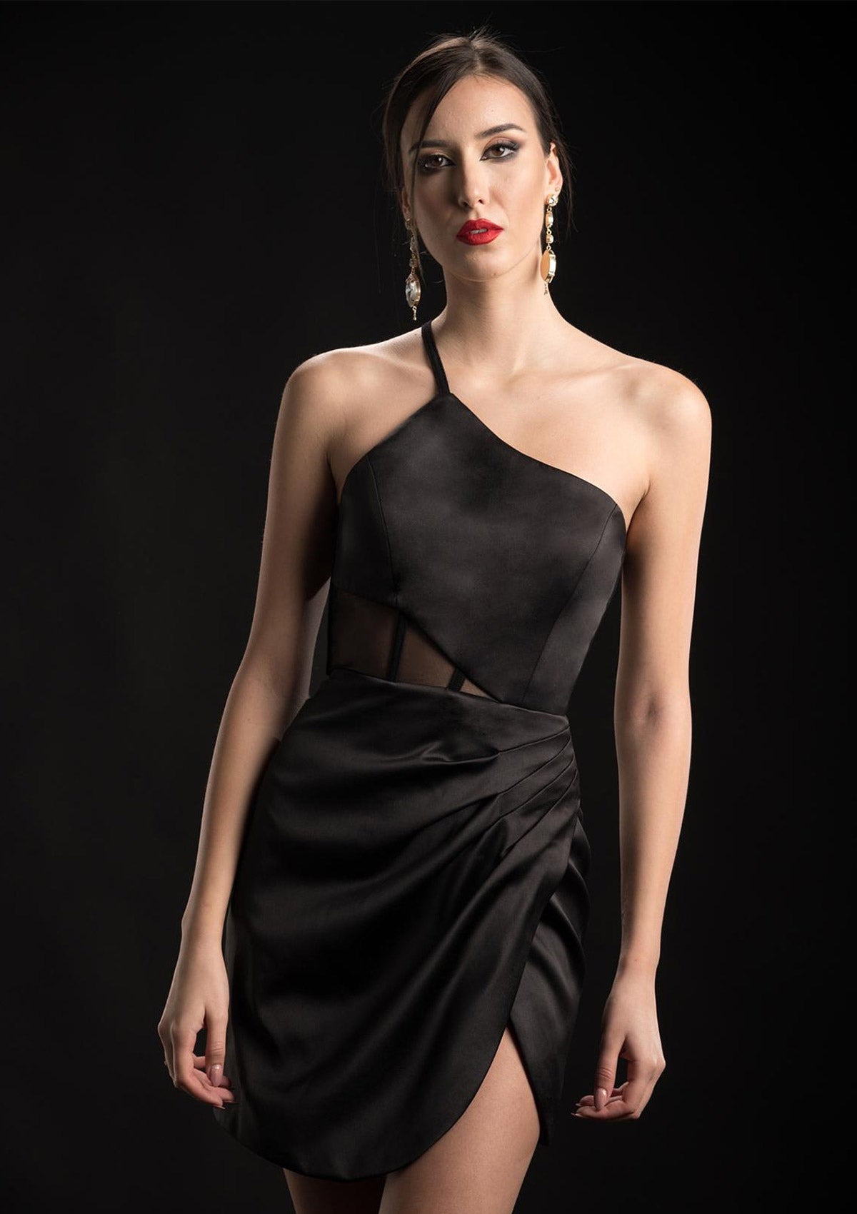 Елегантна къса рокля от сатен с набор и закачлива цепка.